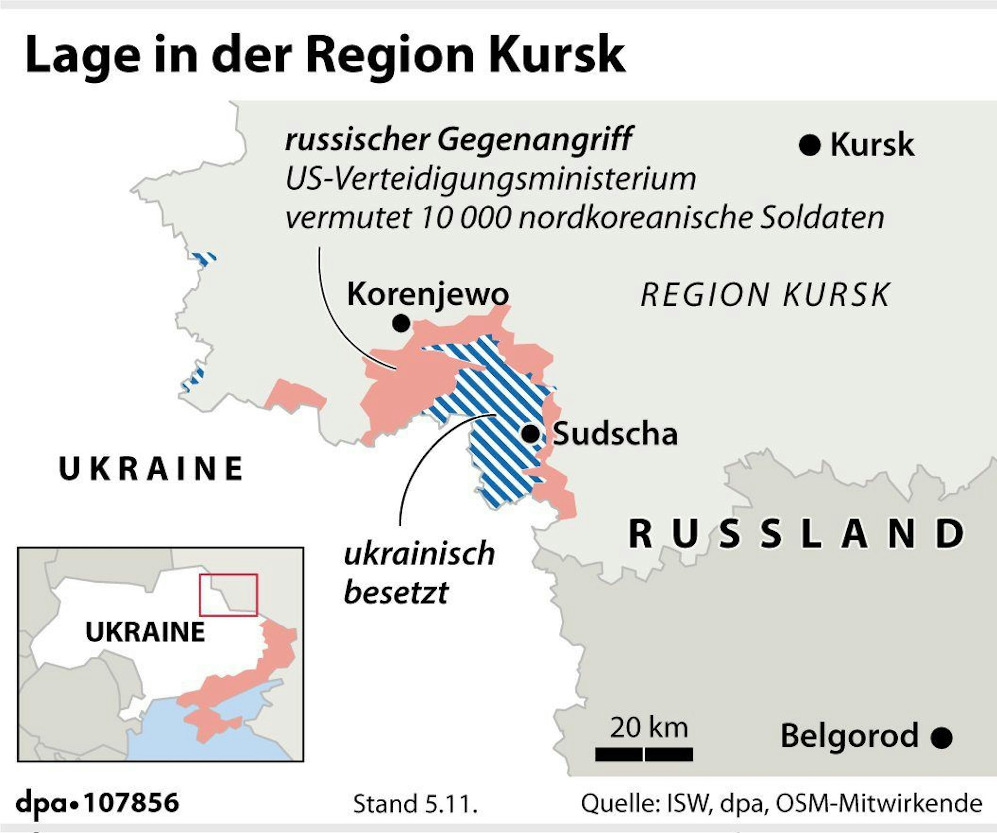Auch unter den Nordkoreanern soll es seitdem bereits Verluste gegeben haben. Seit die ukrainischen Truppen nach Kursk vorgedrungen sind, habe Russland in der Region mehr als 20.000 Soldaten verloren, erklärte der ukrainische Oberbefehlshaber Oleksandr Syrskyi zuletzt. Fast 8.000 der Soldaten sollen laut Kiews Angaben getötet worden sein. Mehr als 1.100 russische Waffen und Fahrzeuge seien zerstört worden. Auch diese Angaben lassen sich nicht unabhängig überprüfen.