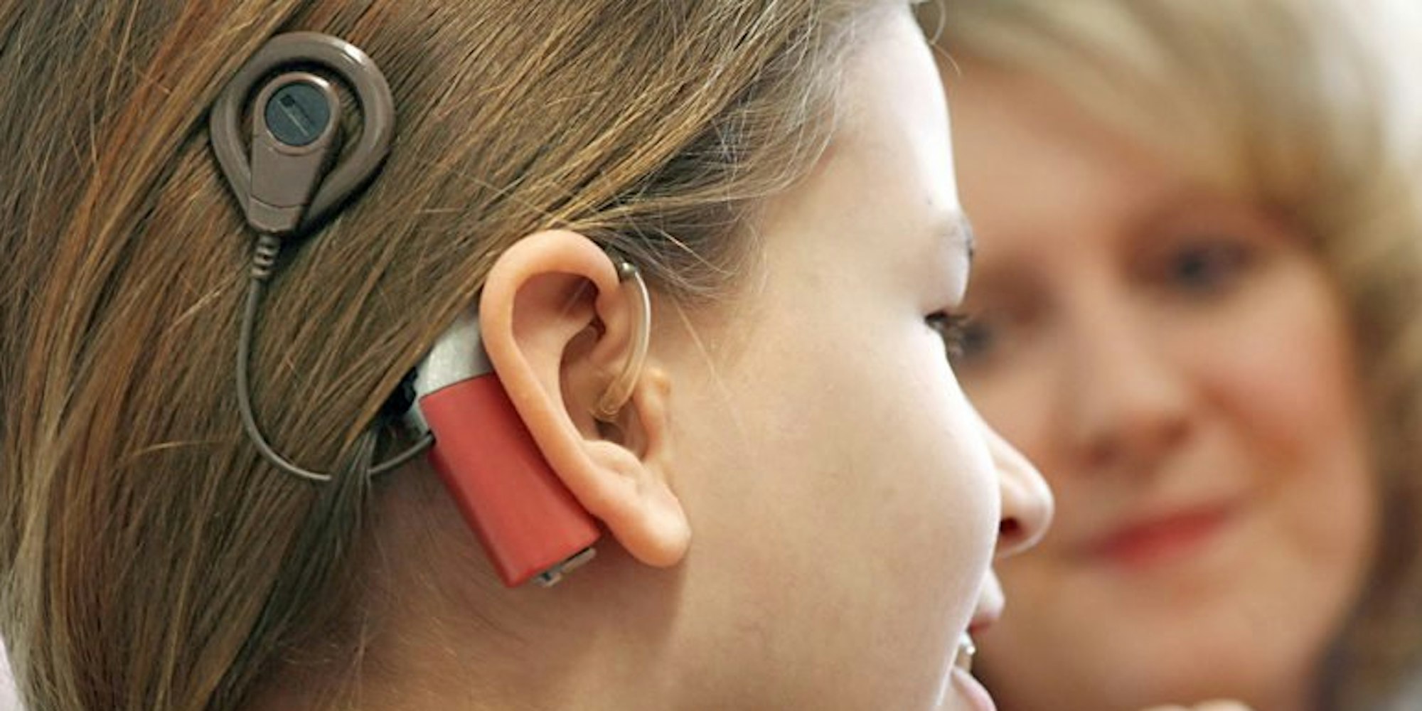 Ein Mädchen mit Cochlea-Implantaten: Der Sprachprozessor sowie die Sendespule, die außen am Kopf getragen werden, bleiben nach der OP sichtbar.