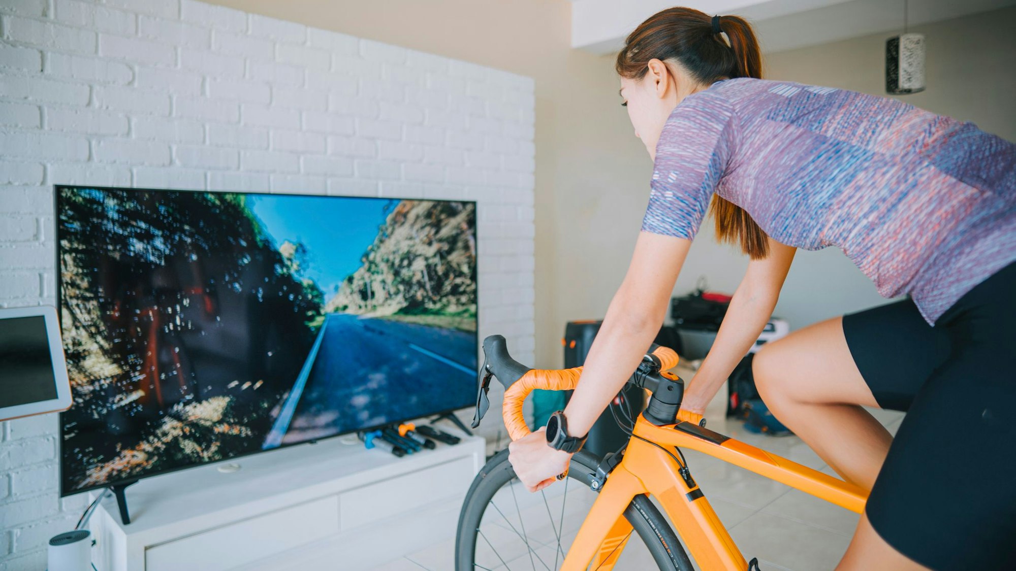 Dazu gibt es jede Menge Ausstattungsmöglichkeiten. Rad und Trainer sollten aus Gründen der Standfestigkeit auf eine Gummimatte gestellt, das Tablet kann auf dafür konzipierte Tische platziert werden. Und wer im Wohnzimmer nicht auf Fahrtwind verzichten will, kann sich diesen aus Simulatoren ins Gesicht wehen lassen.