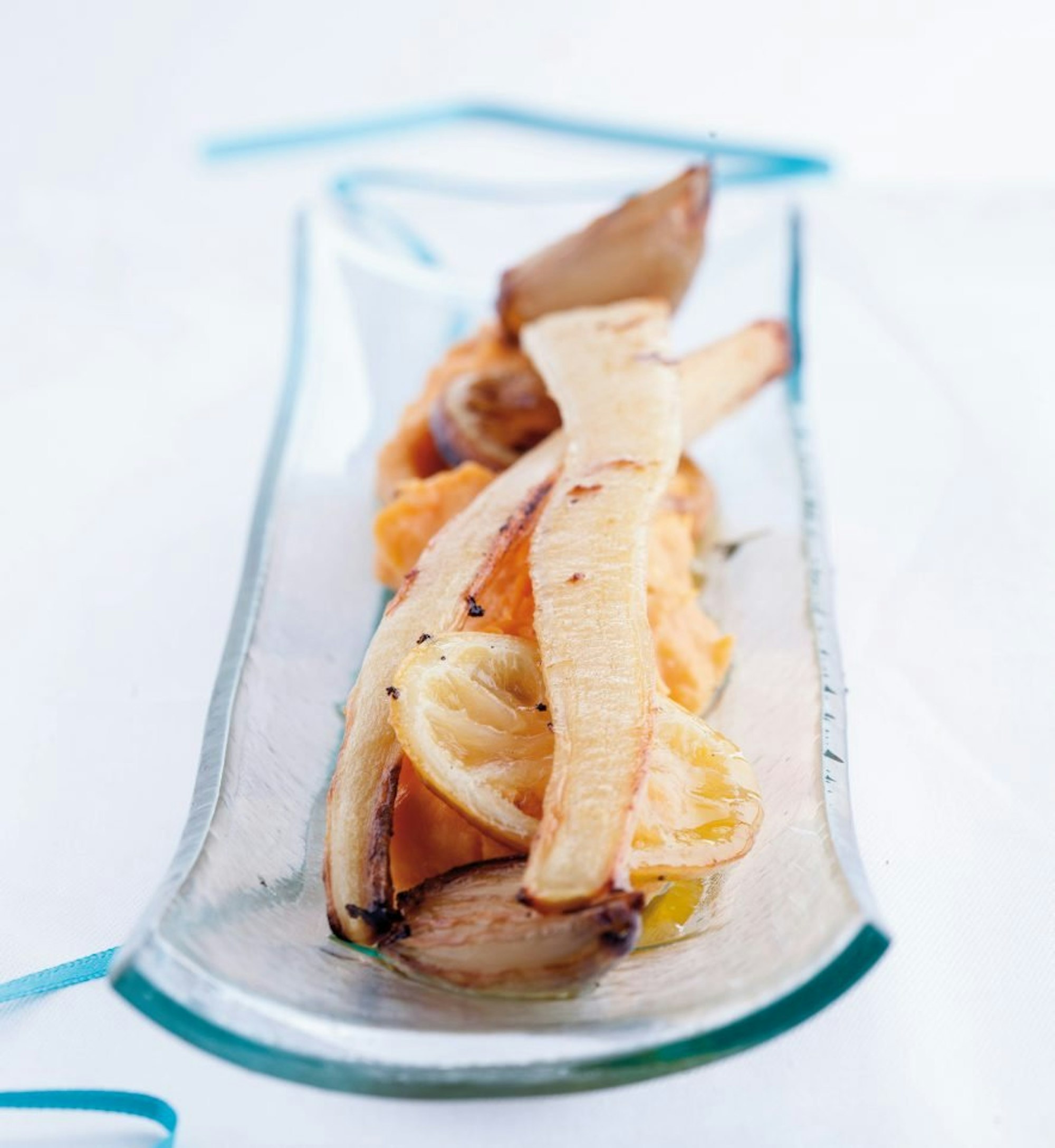 Der Hauptgang - geschmorte Petersilienwurzel auf Süßkartoffelpüree - ist etwas für Bauch und Auge.
