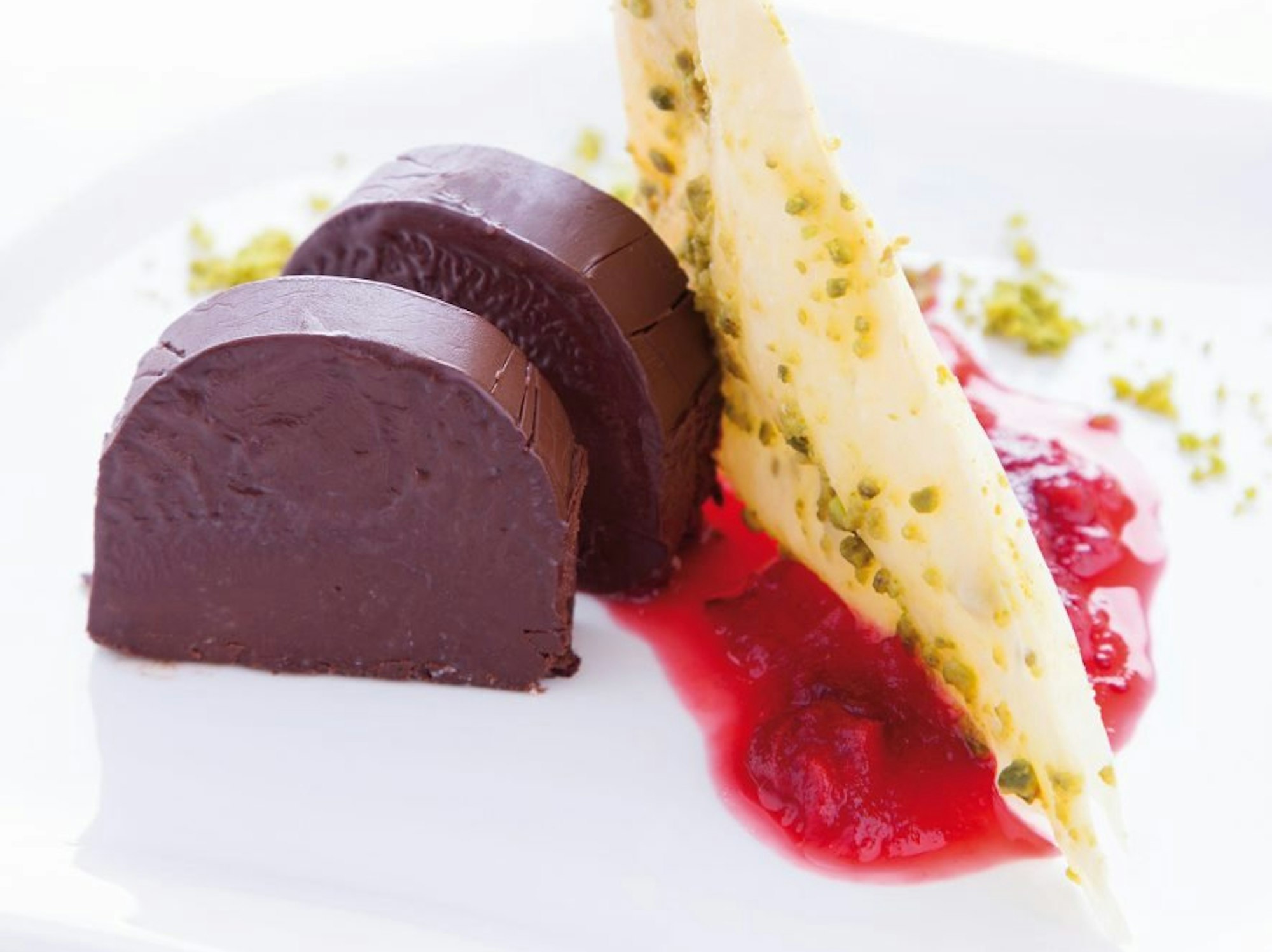 Leckeres Dessert: Ohne Milch und Eier kommt die Schokoterrine an Cranberrykompott aus.