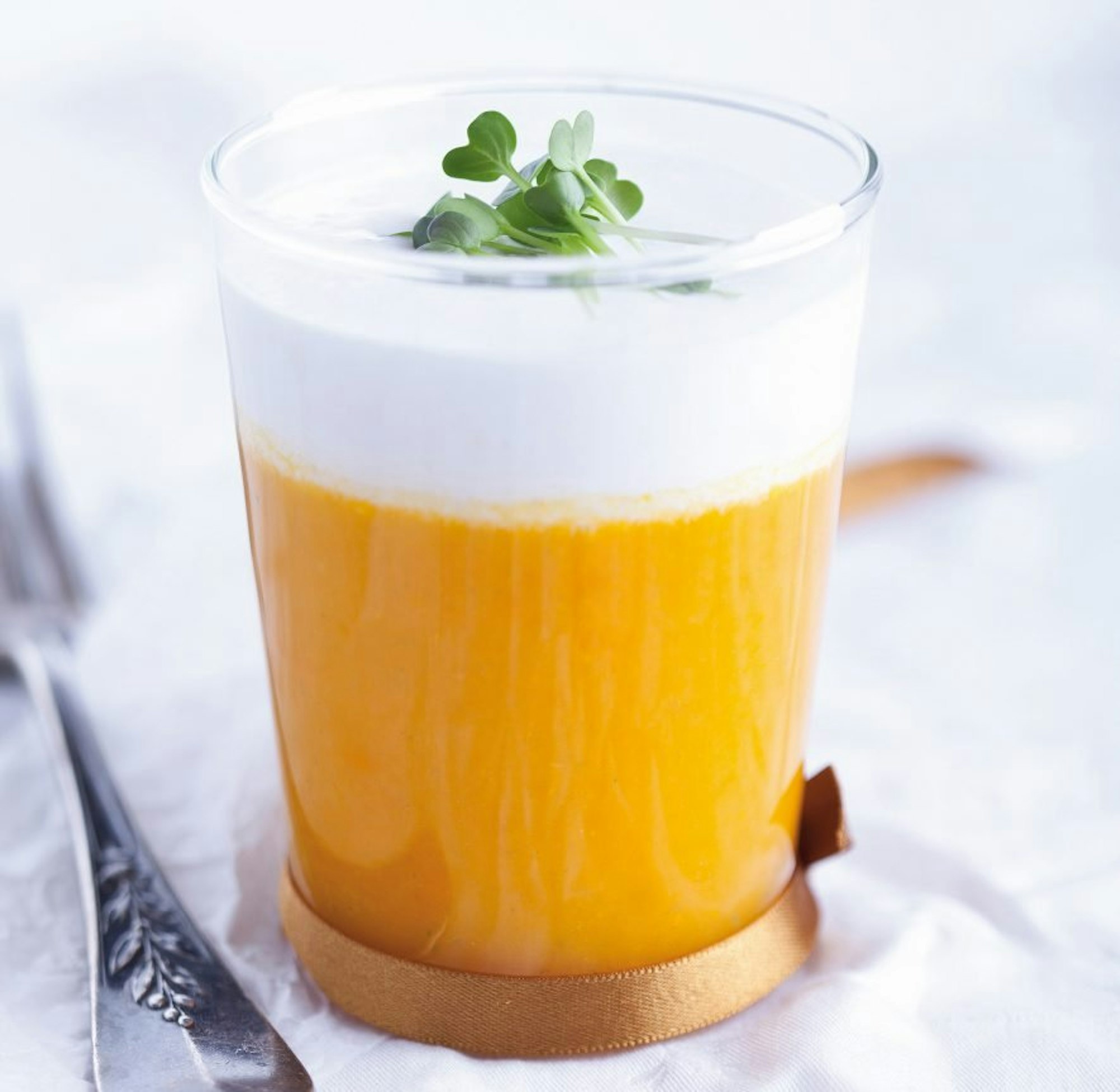Für jedes Weihnachtsmenü geeignet ist die vegane Vorspeise: Karottensuppe mit Kokos-Ingwer-Schaum.