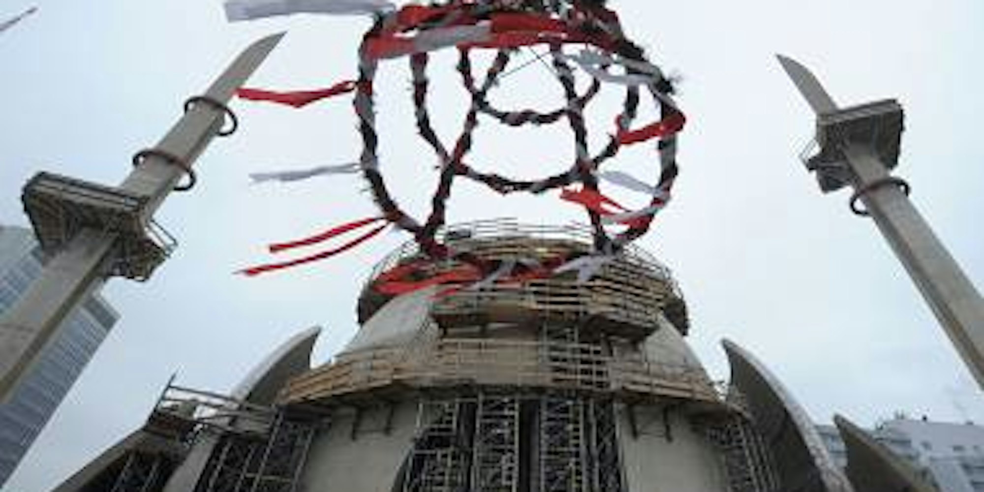 Ein Richtkranz hängt am Mittwoch in Köln-Ehrenfeld beim Richtfest über dem Hof des Rohbaues der Zentralmoschee. Die Meinung der Bevölkerung zum Bau des Gotteshauses ist gespalten. (Bild: dpa)