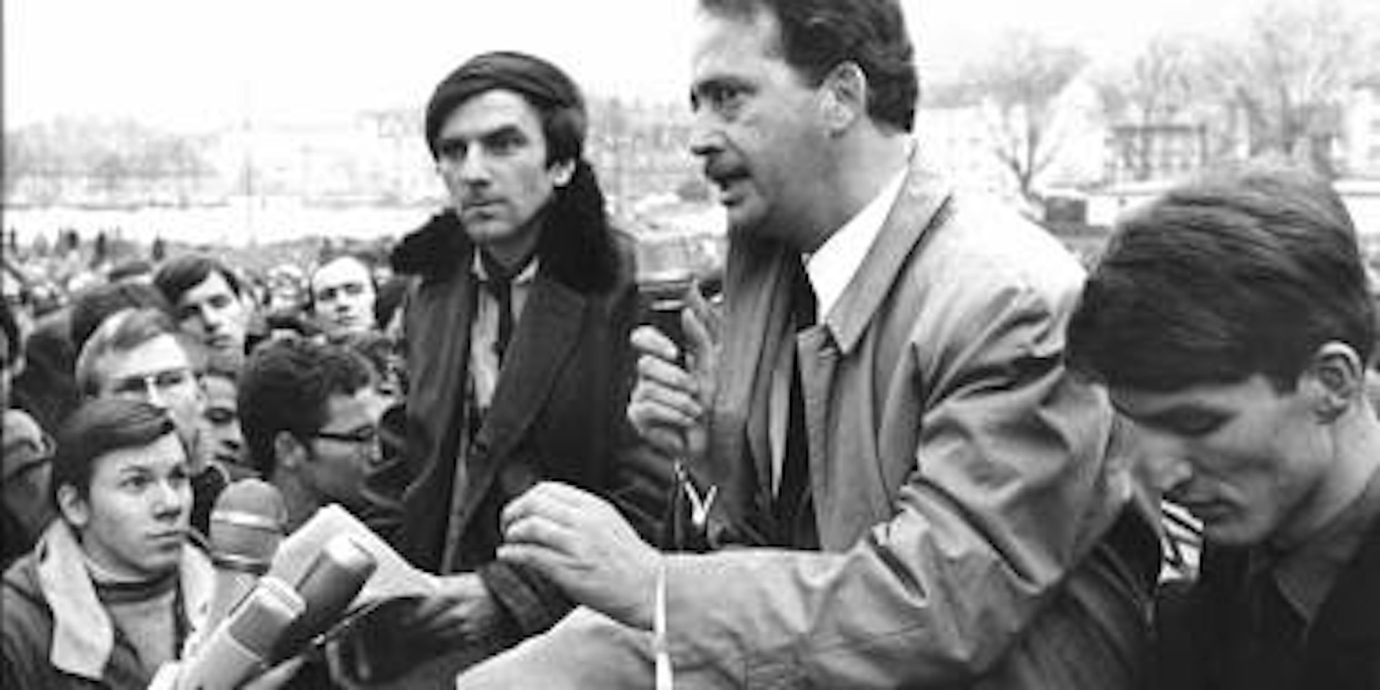 Symbolhafte Stene: Ralf Dahrendorf (2. v. r.), diskutiert im Januar 1968 mit dem Studentenführer Rudi Dutschke (links daneben). (Bild: dpa)
