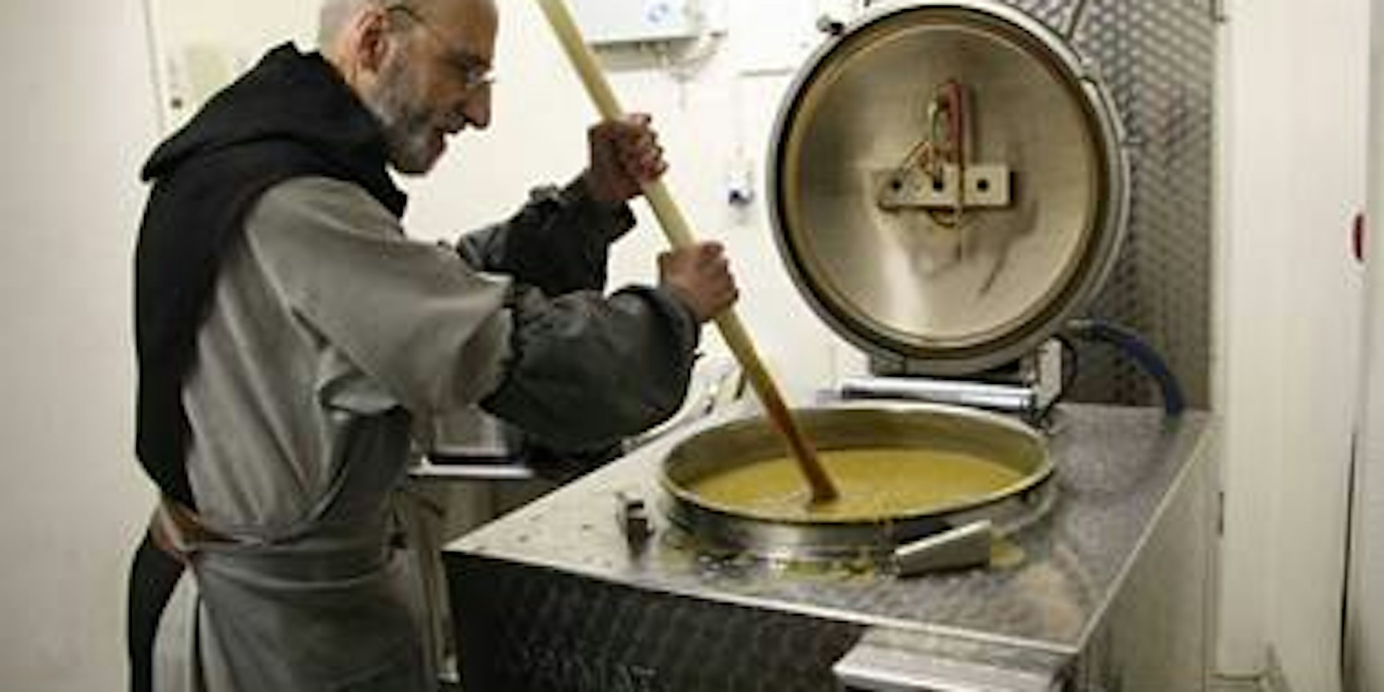 Die bekannte Mariawalder Erbsensuppe: Auch wenn keiner der Mönche mehr als Koch arbeitet, rührt Bruder Bernhard die Suppe mal um – das Rezept verrät man im Kloster aber nicht. (Foto: Hilgers)