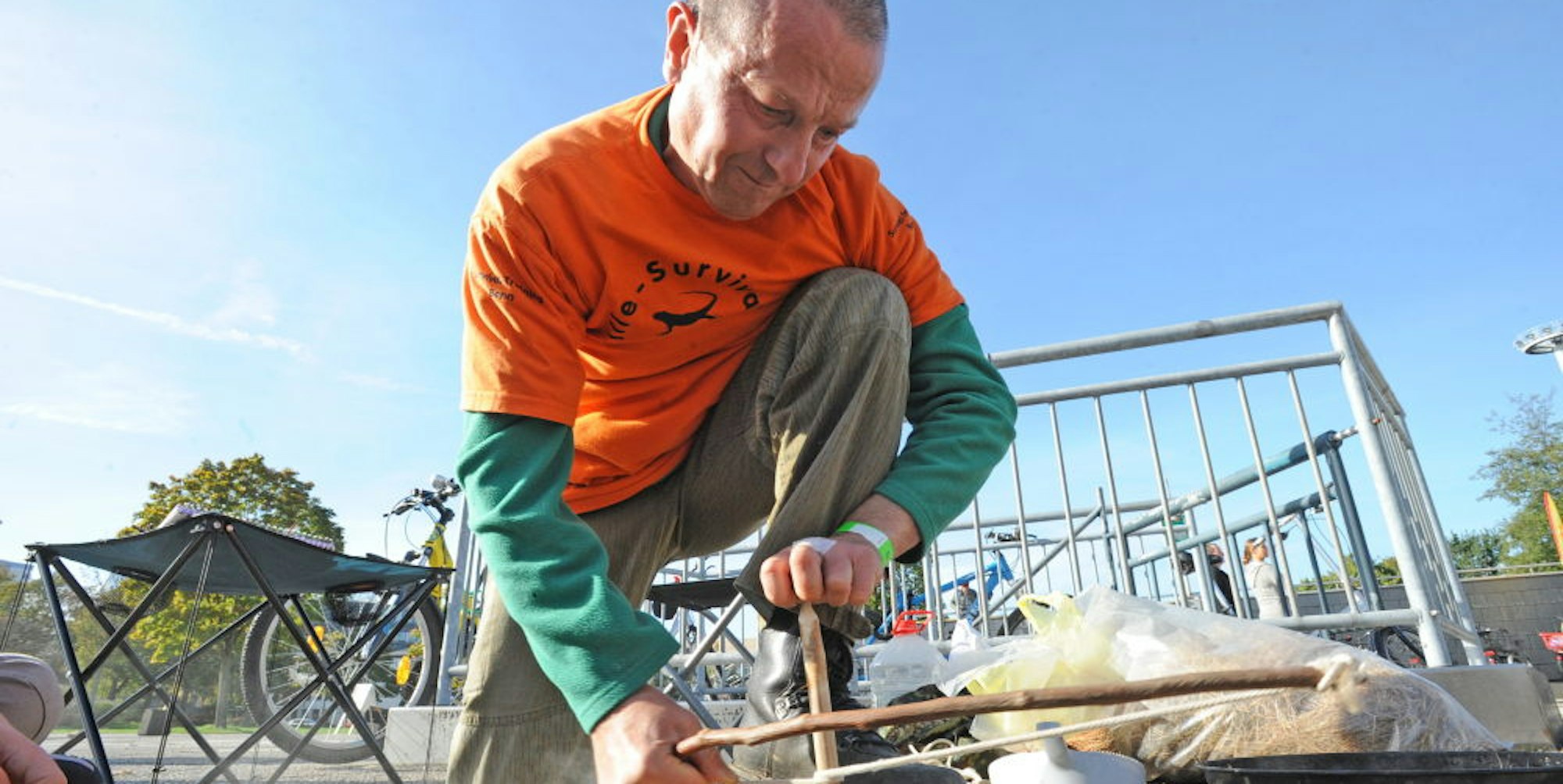 Wie vor der Berghütte: Patrick Gniesmer entfacht ein Lagerfeuer.