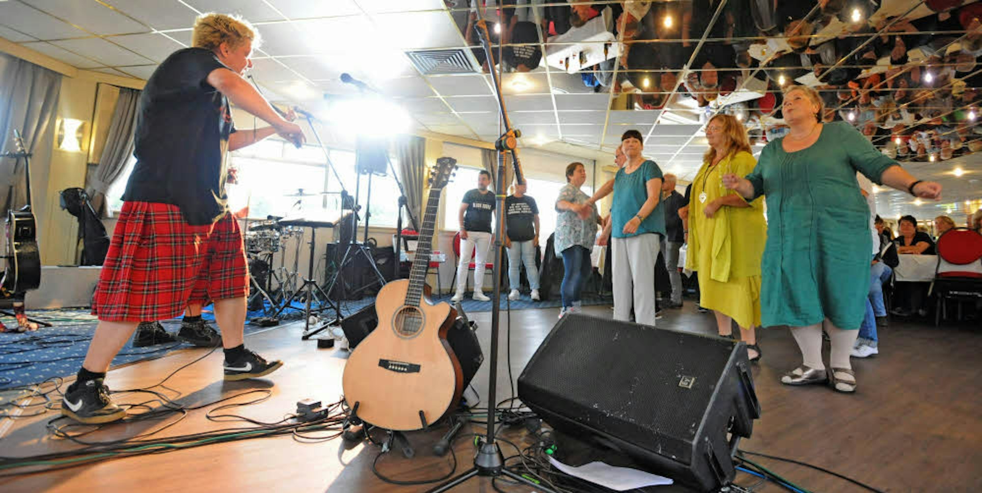 Mit „alle“ sind 450 Gäste gemeint. Ausverkauft. Mal wieder. Alle Plätze besetzt – es sei denn, die Stühle an den Tischen bleiben gerade einmal leer, weil getanzt wird zum Irish Folk von Garden Of Delight. Zum Blues von M. B. Fetch. Zum Rock der Sean Webster Band. Oder zum alles umfassenden Genre-Mix des Duos Korn und Sauter.