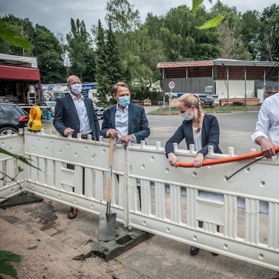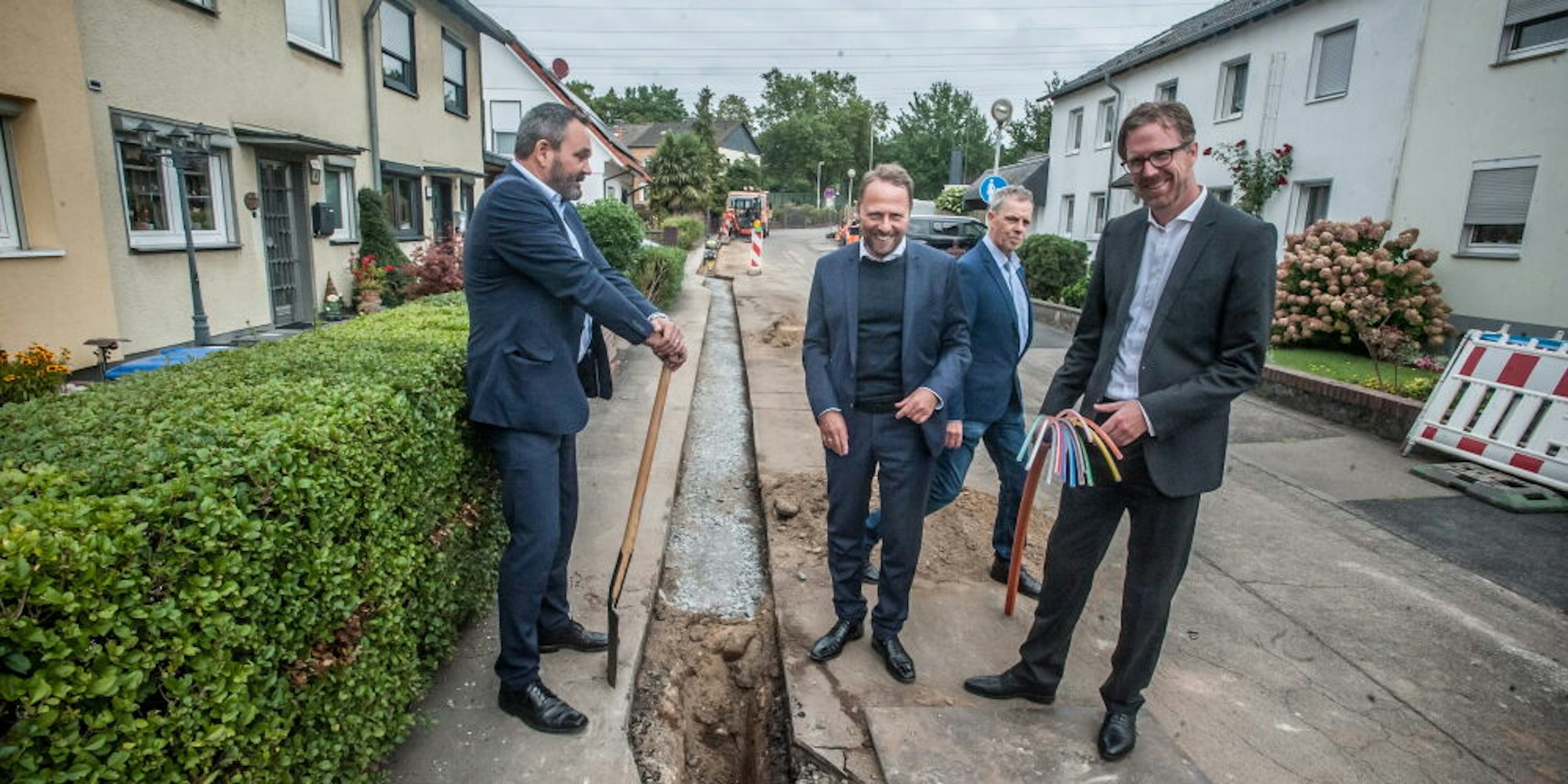 Ulrik Dietzler (EVL), Oberbürgermeister Uwe Richrath, Richard Bulka (ArteneKom) und Claus van der Velden (NetCologne) am „Tatort“ der Glasfaserverlegung im Michaelsweg.