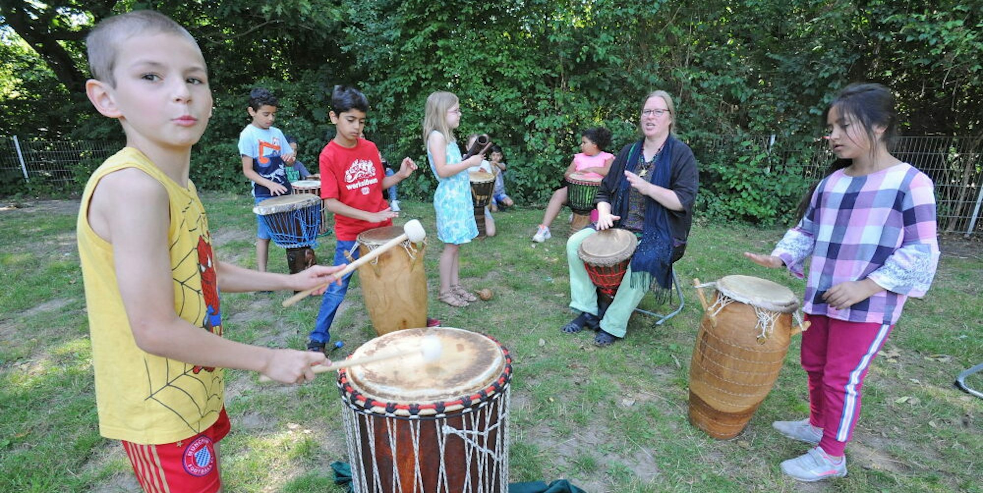 Leverkusen – Richtig toll habe die ältere Frau aus der Nachbarschaft gefunden, was sie hier für die Kinder machten, erzählt Iris Bich-Joppich, dann habe die Frau ihr 40 Euro in die Hand gedrückt: „Für die Kinder“, habe sie gesagt, „damit sie jeden Tag ein Eis bekommen. Sie können ja nicht in den Urlaub fahren, dieses Jahr.“ Eine Reise nach Westafrika konnten zehn Kinder in Alkenrath dennoch unternehmen. Denn Iris Bich-Joppich ist Projektleiterin der Initiative „Zusammen im Quartier – Kinder stärken – Zukunft sichern“ - kurz „ZiQ“. Im Rahmen des Alkenrather Sommers hat sie einen einwöchigen Trommelkurs organisiert, unter freiem Himmel findet er in dieser, der vorletzten Woche der Sommerferien auf der Wiese hinter der Sporthalle der Erich-Klausener-Schule statt. „Mit dem Wetter hatten wir wirklich Glück“, freut Bich-Joppich sich. „Zu Beginn der Woche war es zwar etwas kühl hier draußen, doch in der Sporthalle hätten wir die ganze Zeit Masken tragen müssen.“