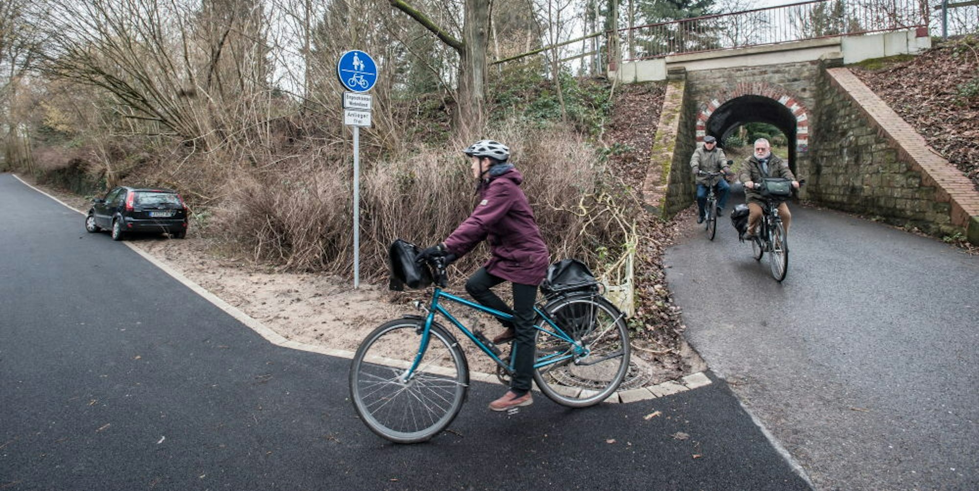 Gute 160 Meter ist die Zufahrt lang, knapp vier Meter breit, und mündet in sanftem Zickzack auf die Fahrradtrasse, die auf insgesamt 30 Kilometern (rund sechseinhalb Kilometer auf Leverkusener Gebiet) Lennep im Osten über Wermelskirchen, Remscheid und Burscheid mit Opladen im Westen verbindet.