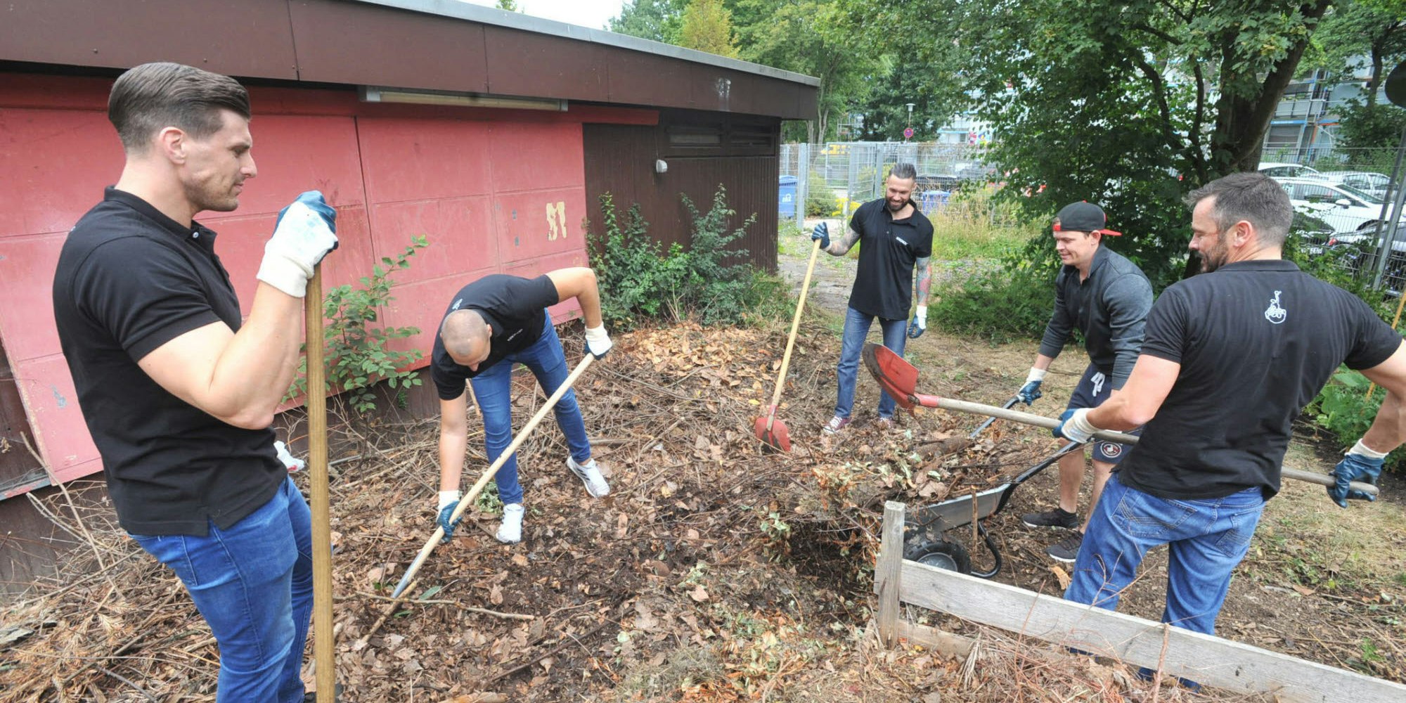 Im vergangenen Jahr hatten sie bei Kronos Titan ein Komitee aus Mitarbeitern des Unternehmens gegründet, das sich um soziale Projekte in der Stadt kümmert. Die Mitglieder dieser Gruppe schlagen bei regelmäßigen Treffen vor, wo man sich in Leverkusen einbringen könnte. Die entsprechenden Einrichtungen werden kontaktiert, ein Termin abgesprochen. Und dann: wird geholfen. In diesem Jahr waren Abdiji, Pütz und Kollegen beispielsweise schon im Altenheim Alkenrath, beim Naturgut Ophoven und dem Deutschen Kinderschutzbund, um ihre Dienste anzubieten. Der Bauspielplatz in Rheindorf war nun Projekt Nummer vier – und der Einsatz lohnte sich: Der über Monate des Links-Liegen-Lassens schlichtweg zu hoch gewordene Humus- und Gartenabfallhaufen neben den Gebäuden des Bauspielplatzes wurde endlich abgetragen. Zuständig dafür war das Quartett der Kronos-Spatenschwinger um Ralf Wunder, Kevin Hedrich, Sven Hartmann und Timo Stroh. Anika Müller rupfte derweil Unkraut aus Steinritzen. Ein paar andere Mitarbeiter brachten den Bolzplatz auf Vordermann.