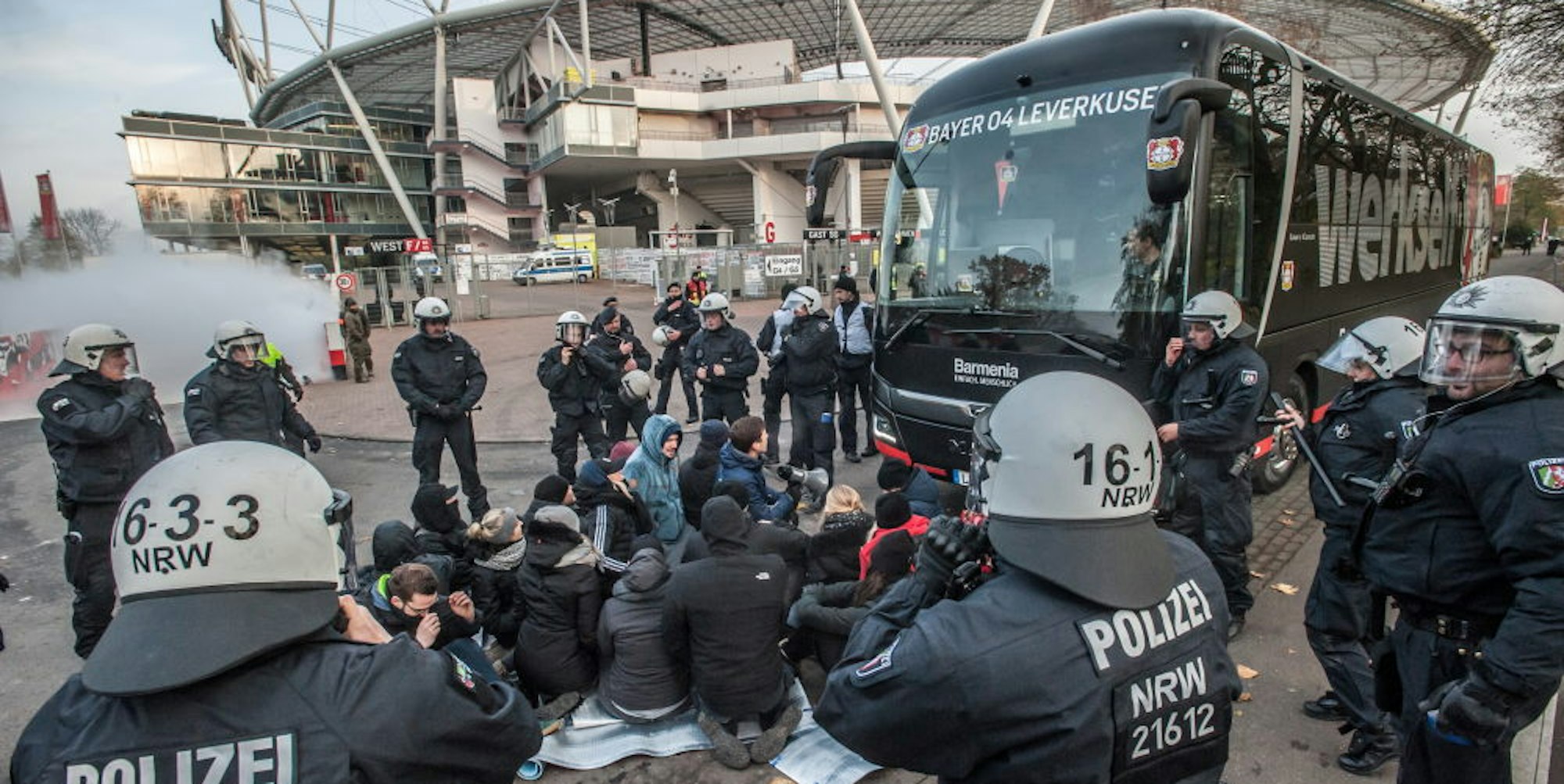 Das Auflösen einer Sitzblockade trainieren mehrere Hundert Polizisten an der BayArena – mit echtem Bayer-04-Bus.