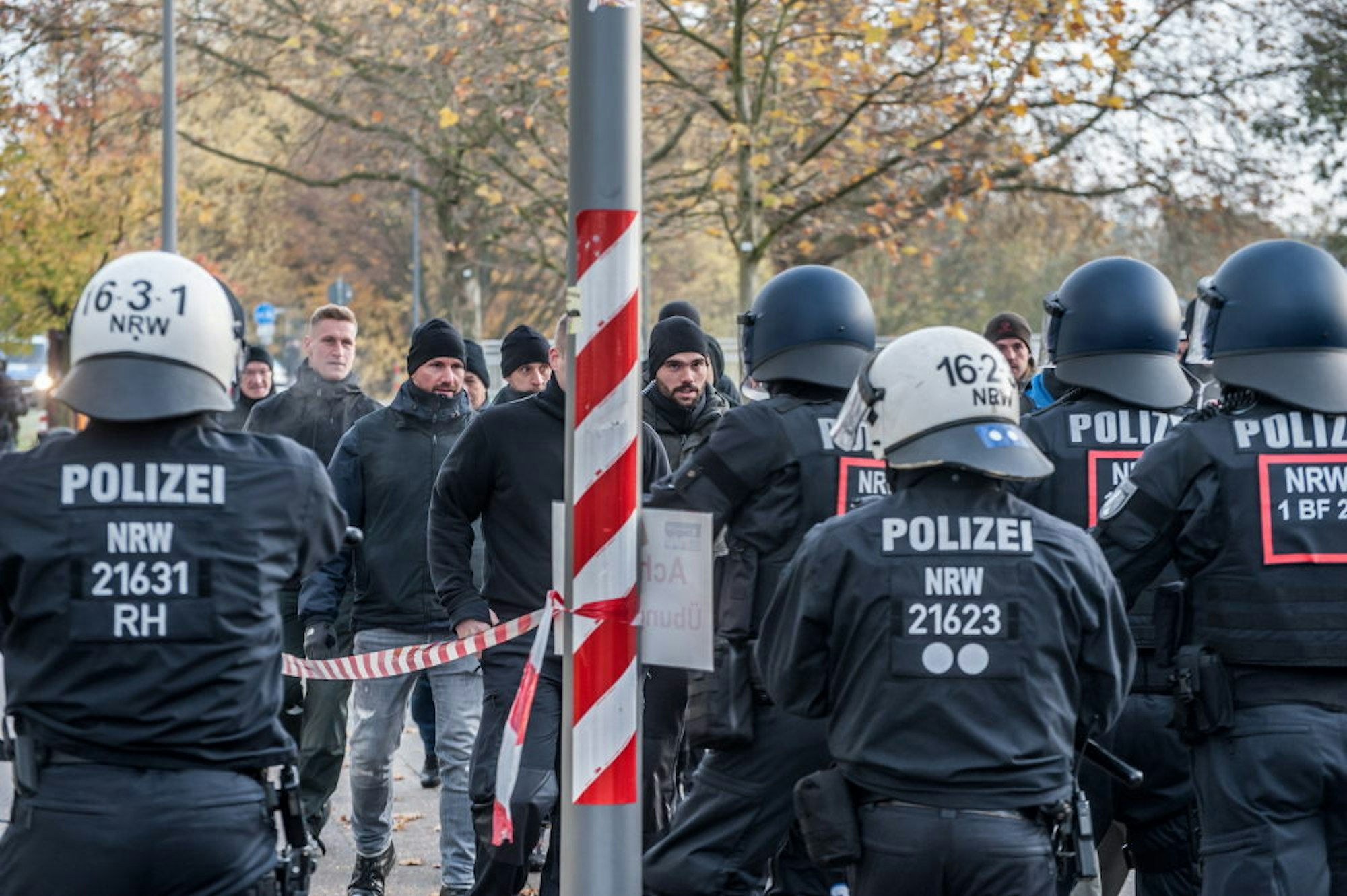 Nach der Explosion fährt der (original) Bayer-04-Mannschaftsbus vor, sofort stürzt sich eine Horde von schwarz gekleideten Ultras auf ihn und bringt ihn zum Stoppen: Sitzblockade. Auch die „andere Seite“ wird natürlich von Polizisten gespielt. Einige haben sich mit Sonnenbrille und Kapuze vermummt. Jeder muss sich erst noch mit den neuen Rollen vertraut machen. „Kommt raus! Hast wohl keine lange Unterhose an, ne?“, ruft der „Anführer“ der Sitzblockade der vermeintlichen Fußballmannschaft im Bus zu und erntet Gelächter von seinen Kollegen. Bei Temperaturen von knapp über Null Grad haben die „Ultras“ auch daran gedacht, Isomatten mitzunehmen, um bei der Sitzblockade nicht auf dem kalten Asphalt sitzen zu müssen.