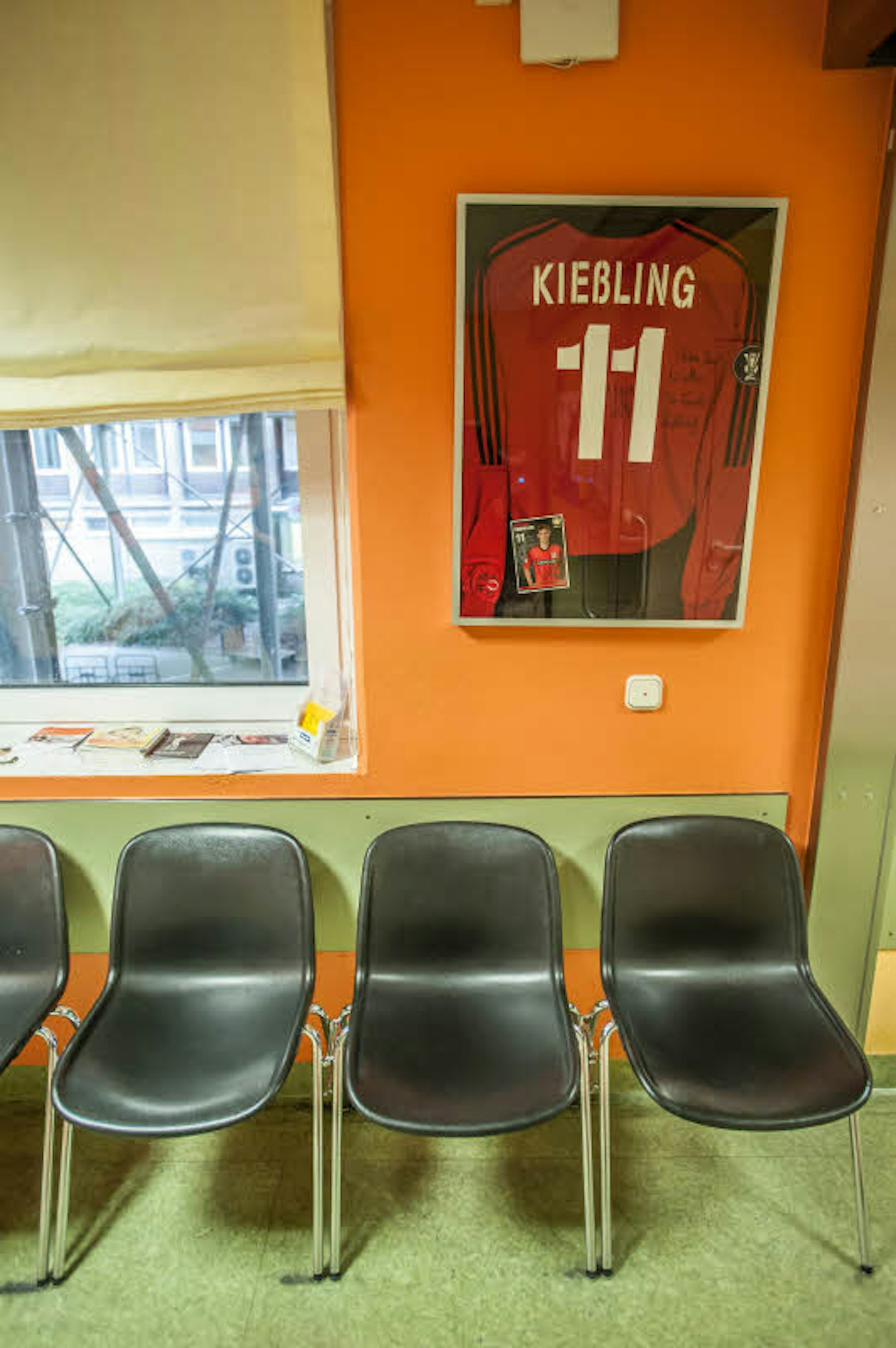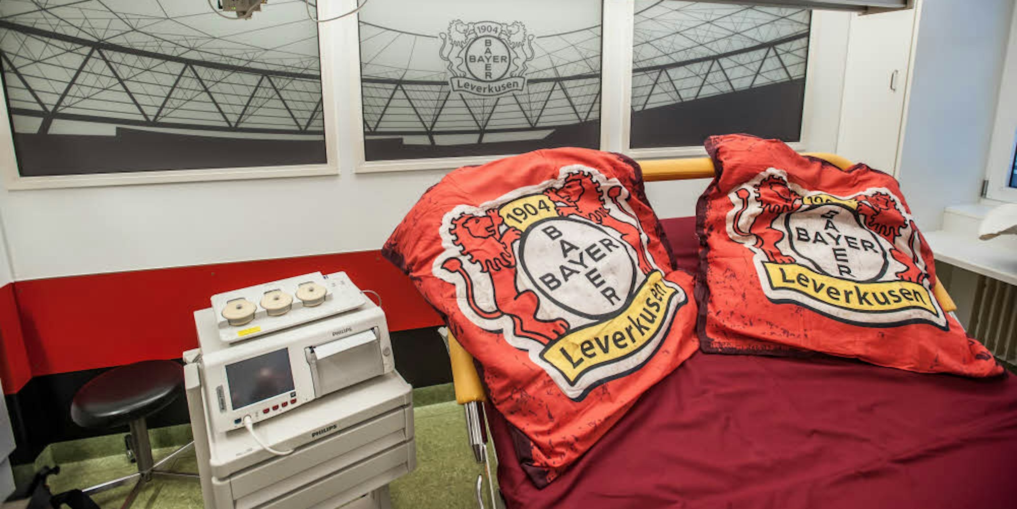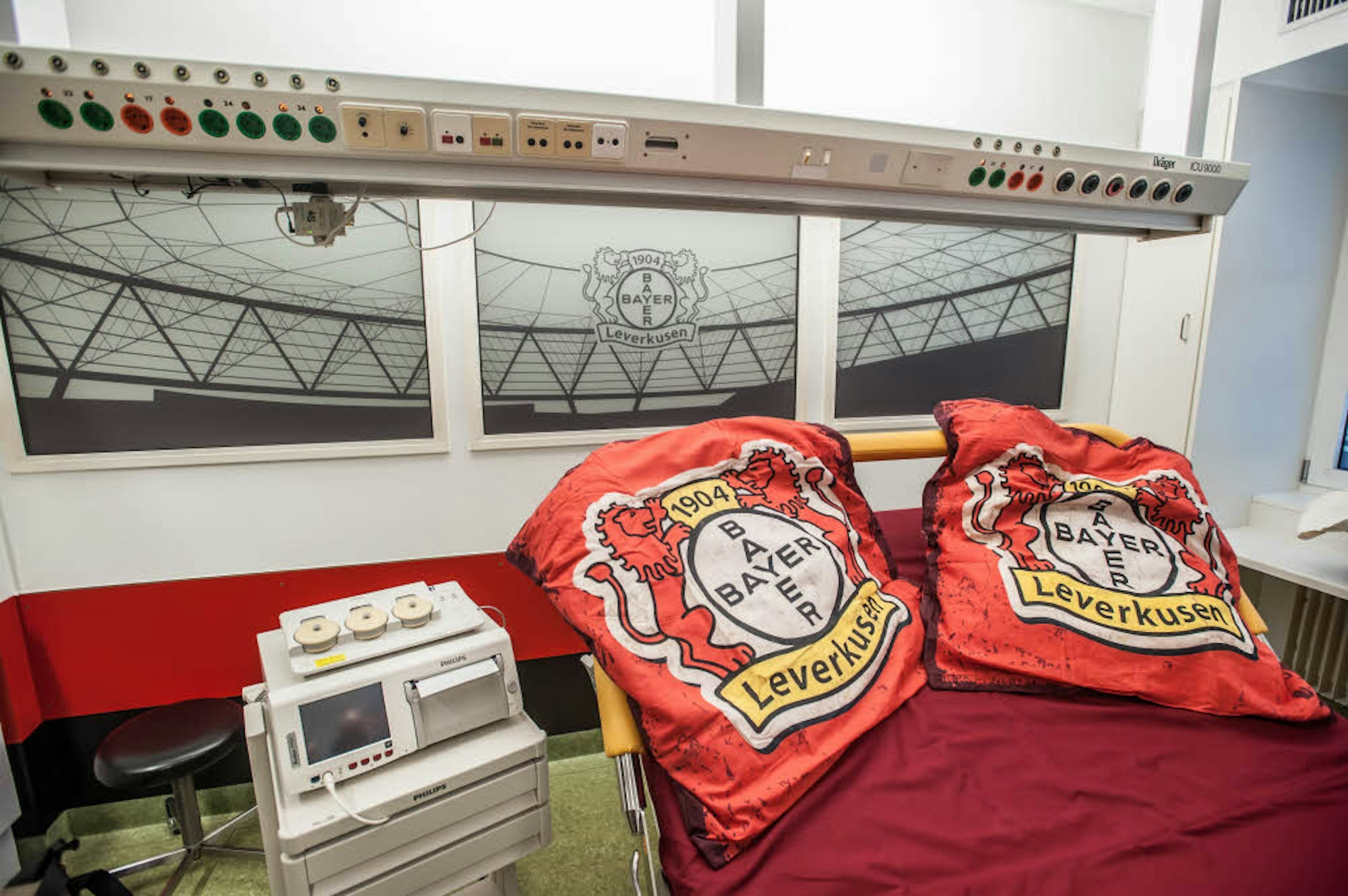 Die Kissen tragen das Vereinslogo, ebenso wie die Bilder an der Wand, die die Perspektive aus dem Stadion auf das Dach der Bay-Arena simulieren.