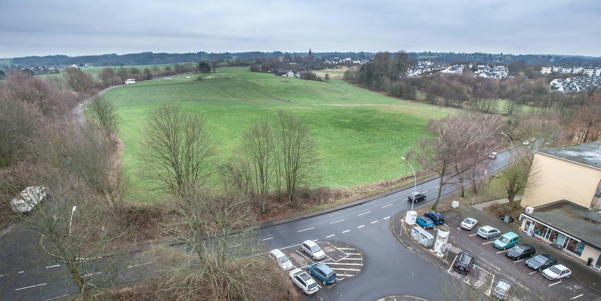 Das von Nord nach Süd um rund 15 Meter abfallende Gelände soll von einer oder zwei Straßen erschlossen werden, die Kita mit acht Gruppen jeweils im nördlichen Drittel des Areals stehen und auf jeden Fall ein Obergeschoss, vielleicht sogar ein Untergeschoss bekommen. Insgesamt sollen 1,3 oder 1,4 der drei Hektar Land bebaut werden.