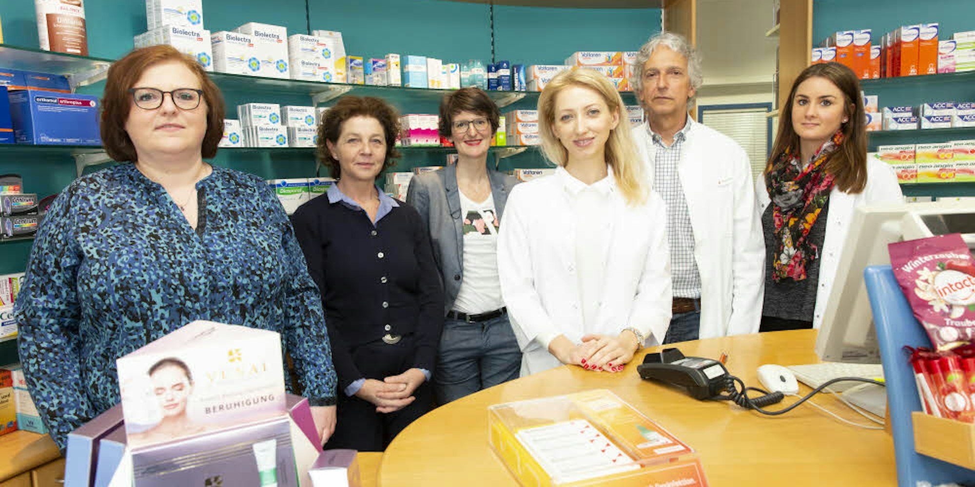 Die Ausbildung von Anna Pauls (M.) stellten Katrin Erb-Ruck (Arbeitsagentur), Ute Schwarz vom Jobcenter, Eva Vanmarcke (ModUs), Apotheker Rainer Ciesla und Ausbilderin Alessa Wilden (v. l.) vor.