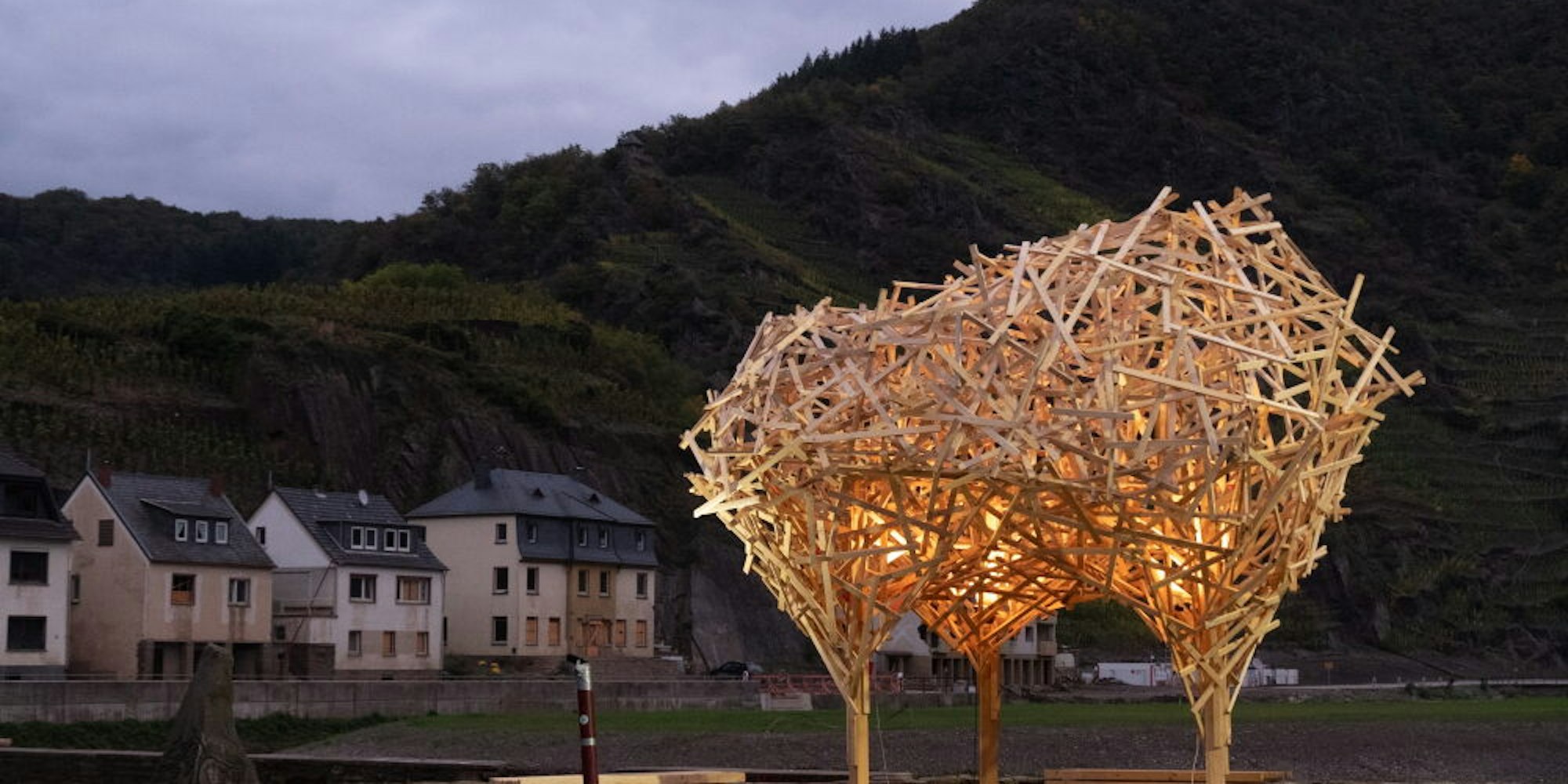 Alfter/Mayschoß – Aus etwa 600 Latten haben Studierende der Alanus Hochschule Alfter drei Bäume zusammengezimmert. So kahl, wie die Ahr nach der Flut vom 14. Juli das Ufer in dem ältesten Weinort der Ahr hinterließ, ertrugen die Master-Anwärter aus dem ersten Jahr bei Professor Willem-Jan Beeren den Platz nicht. „Anwohner hatten dort bereits Blumen gepflanzt, wo eine Skulptur stehen geblieben ist, obwohl die Ahr mehrere Meter hoch dort darübergeflossen war“, sagt Beeren. Es handelt sich um einen Teil des Kriegerehrenmals.