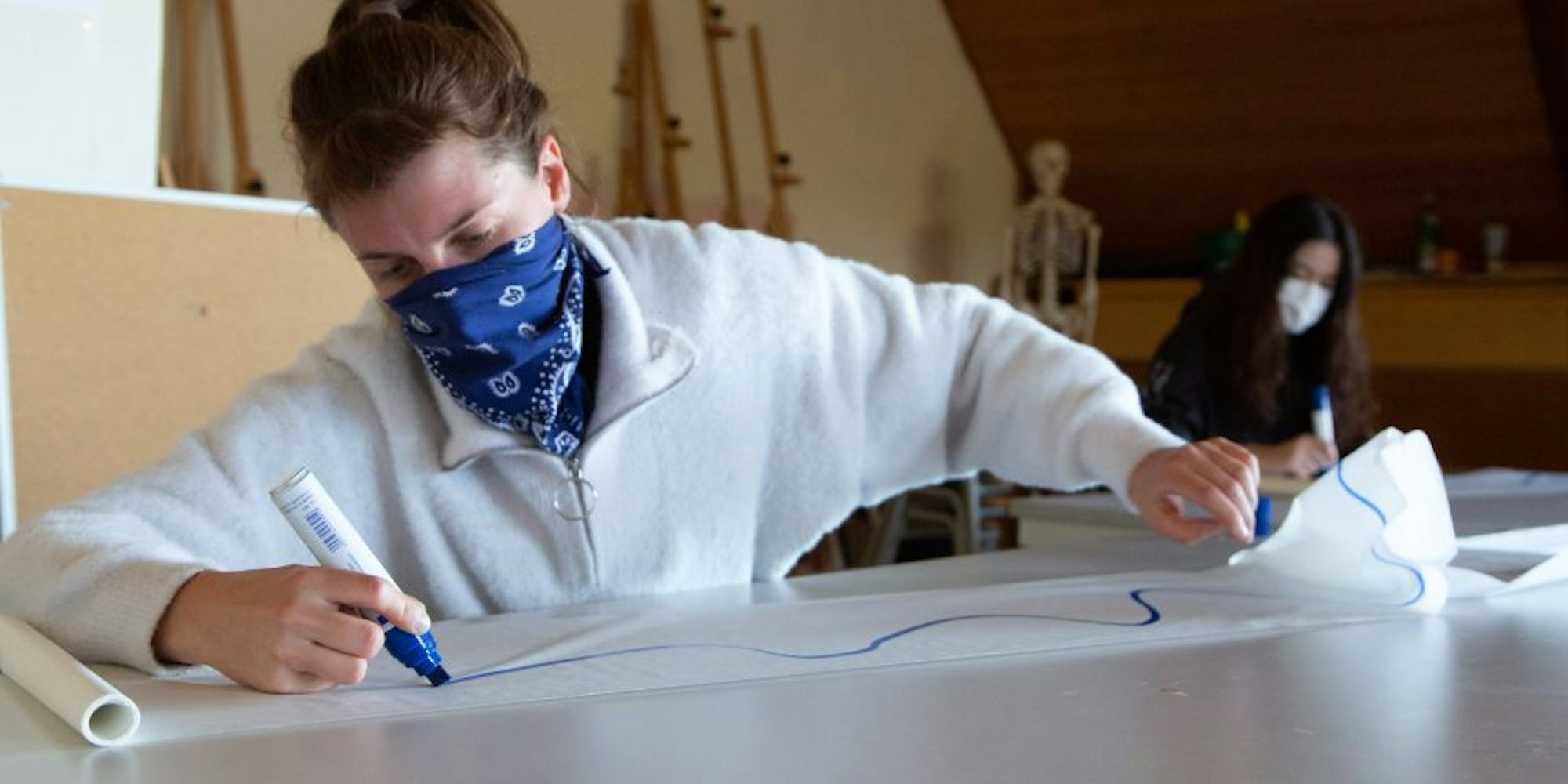Während sechs Teilnehmer den Boléro sitzend verfolgen und dabei arbeiten, steht Christina Querfurt beim ersten Ton auf und lässt ihren blauen Filzstift unvermittelt und intensiv über das Papier gleiten. Es wirkt wie eine kreative Entladung. Am Ende des berühmten Orchesterstücks, nach etwa einer Viertelstunde, hat Querfurt nicht eine, sondern gleich zwei 16-Meter-Rollen verarbeitet. Das Halstuch, das die Masterstudentin aus Köln über Mund und Nase gezogen hat, scheint bei ihrer räumlich zwar begrenzten, aber trotzdem überaus aktiven Arbeit nicht zu stören. „Man ist irgendwann so sehr im Prozess, dass man das vergisst“, sagt Querfurt. Da sie in der Performance-Kunst unterwegs sei, habe sie zwar auch während der digitalen Lehre aktiv sein können; über den analogen Semesterstart freue sie sich trotzdem sehr. „Die Kommilitonen und der Austausch haben schon gefehlt.“