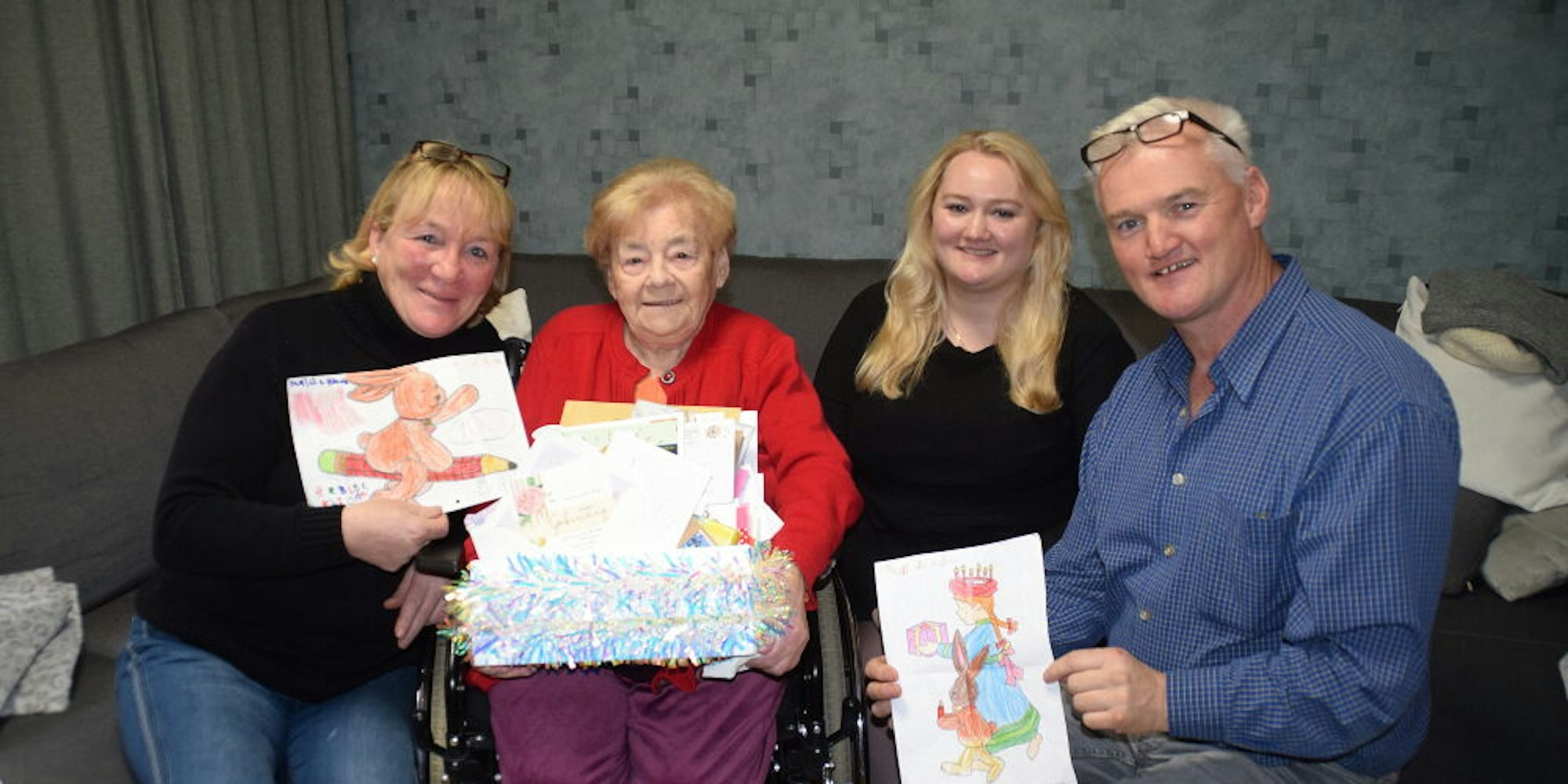 Am 30. November 1920 kam Moser zur Welt, wohnte bis vor anderthalb Jahren in Bonn-Tannenbusch und lebt seit anderthalb Jahren im Oedekovener Seniorenheim St. Elisabeth. Eigentlich wollte sie ihren Geburtstag groß feiern (wir berichteten), doch wegen Corona war das leider nicht möglich. Also rief ihre angeheiratete Enkelin Gabriele Becker (53) über Facebook auf, ihrer Oma doch Geburtstagskarten zu schicken. Die Idee ging auf, über 200 Karten und Geschenke trafen mittlerweile ein: „Es kommen immer noch welche an“, schilderte Gabriele Becker, die mit ihrem Mann Michael (51), Ursula Mosers Sohn, und der gemeinsamen Tochter Nadine (26) in Oedekoven lebt. Am zweiten Adventssonntag nun sichteten sie gemeinsam mit Ursula Moser die ersten Glückwunschkarten und drehten einen Clip für Facebook, um sich bei den vielen Gratulanten zu bedanken.