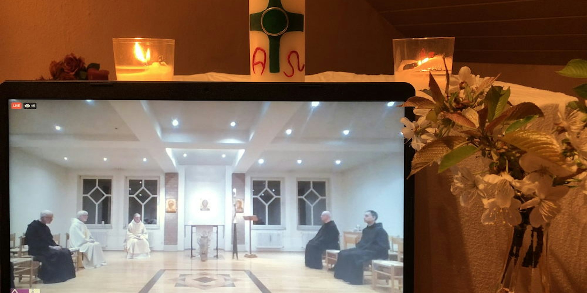Ein Glas Wein, ein paar Stücke Brot, dahinter ist der Laptop aufgebaut. Per Livestream ging es für Sabine von Schmude in diesem Jahr zu den Osterfeierlichkeiten in die Benediktinerabei Kornelimünster, einem Stadtteil von Aachen. Dass Sabine von Schmude per Laptop und Smartphone überhaupt über die Ostertage erreichbar ist, ist der Corona-Krise geschuldet. Denn eigentlich wollte die 43-jährige Bilanzbuchhalterin wie in den Jahren zuvor auch die Tage von Gründonnerstag bis Ostermontag im Kloster verbringen, und das komplett offline. Doch wegen der Pandemie nehmen die Mönche derzeit keine Gäste auf.