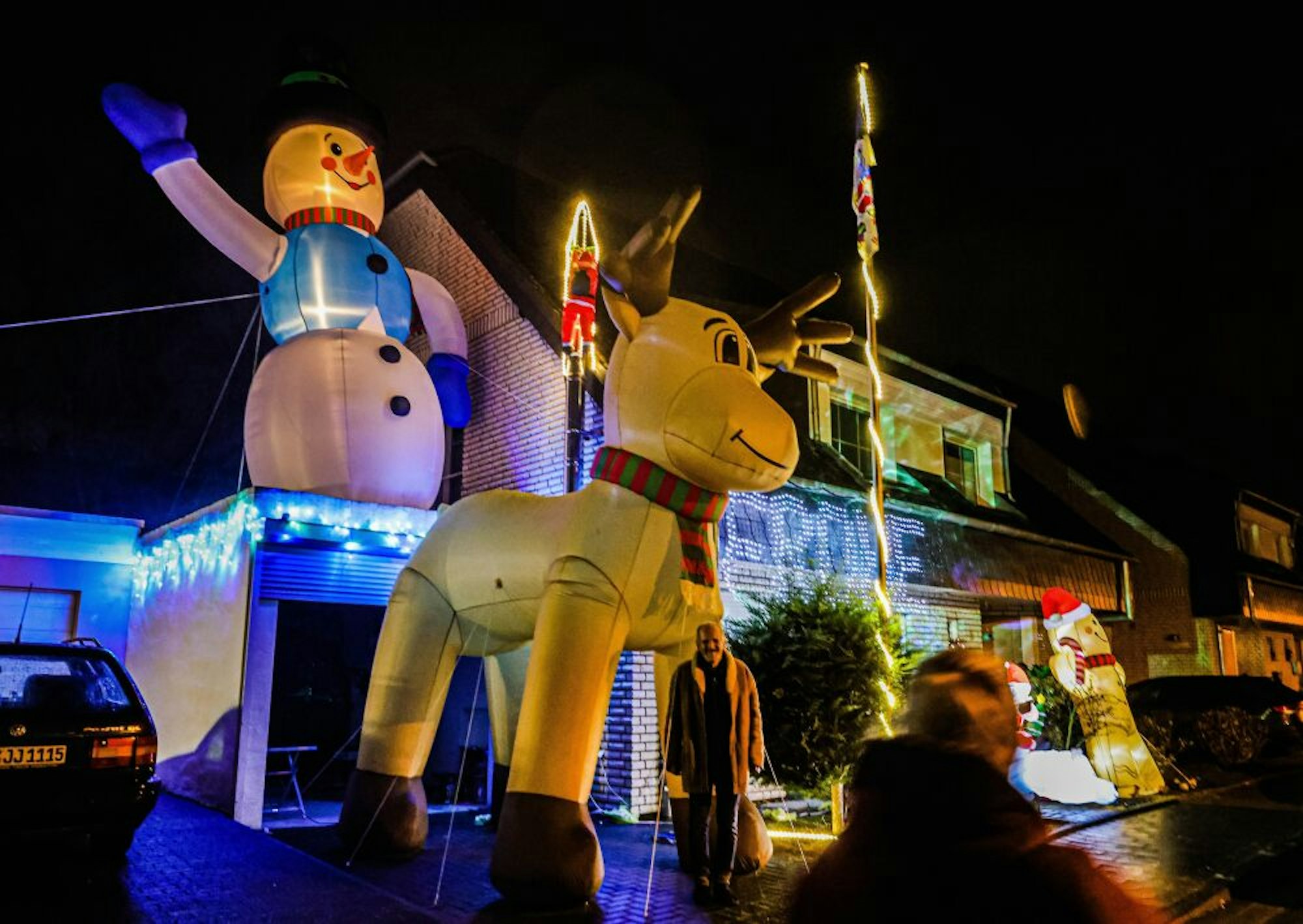 Alfter – Ho, ho, ho! Blinkende Lichterketten, ein meterhoher Weihnachtsmann, glitzernde Tannenbäume und ein Riesen-Rentier mit Schal – in der Raiffeisenstraße in Witterschlick gibt es die Weihnachtsbeleuchtung in XXL. Dort grüßt vom Dach der Garage eines Doppelhauses der sechs Meter hohe Schneemann, knapp fünf Meter hoch ist das Rentier. Stolz kommt auch der Lebkuchenkerl daher, und der Weihnachtsmann ist gleich doppelt unterwegs: Einmal auf dem Rücken eines Eisbären, der freundlich mit dem Kopf wackelt, ein anderes Mal erklimmt er ganz klassisch im rot-weißen Mantel und mit Rauschebart den Schornstein.
