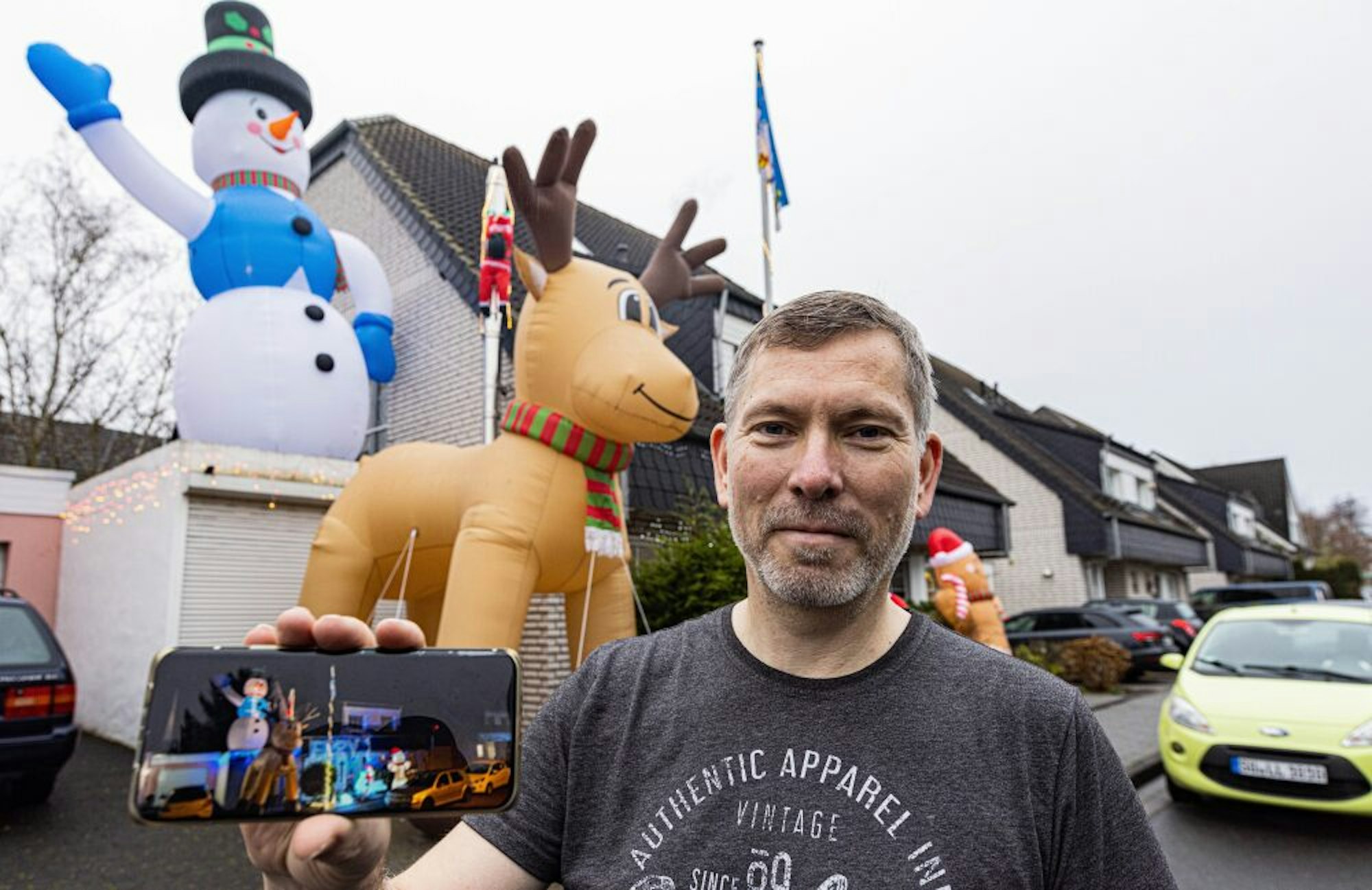 Mit dem Schneemann hatte vor einem Jahr alles begonnen, sagt Wittern. Der sei so gut angekommen, dass sich der Hausherr im Internet noch weitere Figuren dazu kaufte. Seine Lungen kann er dabei schonen: „Alle Figuren haben einen integrierten Mechanismus und blasen sich von allein auf“, schmunzelt der Weihnachtsfan: „Das dauert auch nur ein paar Minuten. Ebenso schnell kann ich die Luft auch wieder herauslassen.“ Anfang Dezember baute er seine Deko auf. Auch die Nachbarn sind begeistert von diesem bunten Figurenzirkus. Einer eifert ihm sogar ein wenig nach: „Er übt aber noch“, scherzt Ralf Wittern und zeigt auf den kleinen leuchtenden Eisbären im Vorgarten nebenan, der neben all den Mega-Figuren ein wenig kümmerlich und vereinsamt daherkommt. Etwas verrückt ist das schon, oder? „Ja“, lacht Ralf Wittern, der im T-Shirt bei Minustemperaturen vor dem Haus stolz seine Lieblinge präsentiert: „Es ist schon wenig kalt heute, aber drinnen ist es ja warm.“
