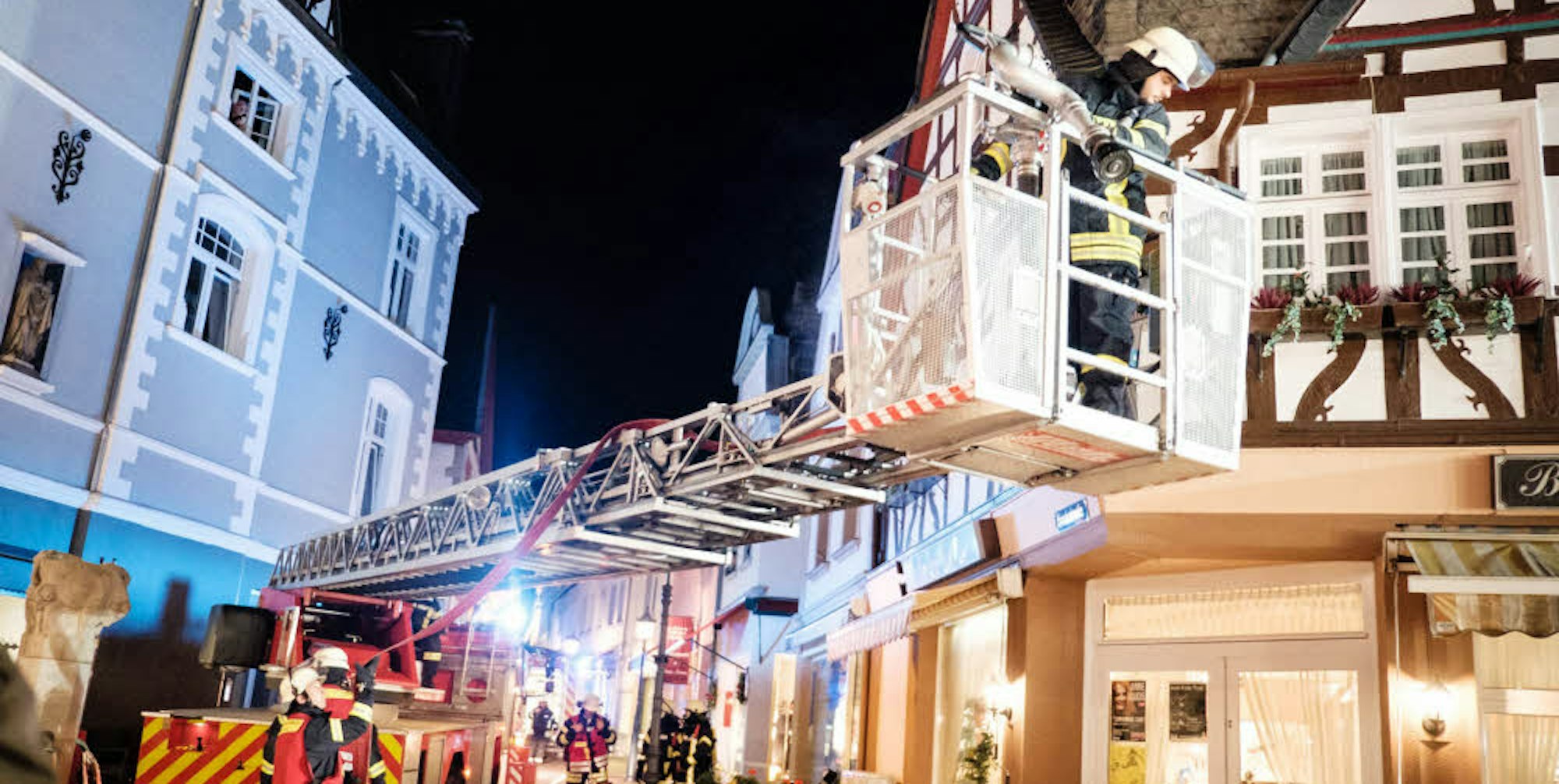 Der Ablauf solcher Einsätze ist fest definiert, wird aber durch die örtlichen Begebenheiten stark beeinflusst. „Gerade die Enge der Straßen in der Innenstadt stellt eine Herausforderung dar“, sagte Björn Haupt, Pressesprecher der Freiwilligen Feuerwehr. „Einerseits müssen die Fahrzeuge erst einmal durchpassen, andererseits benötigen sie am Einsatzort Platz, um in vollem Umfang genutzt werden zu können.“ Ganz offensichtlich ist dies bei der Drehleiter der Fall, die noch einmal ausgerichtet werden musste, um den „Brand“ von oben bekämpfen zu können, um ein Übergreifen auf Nachbarhäuser zu vermeiden.