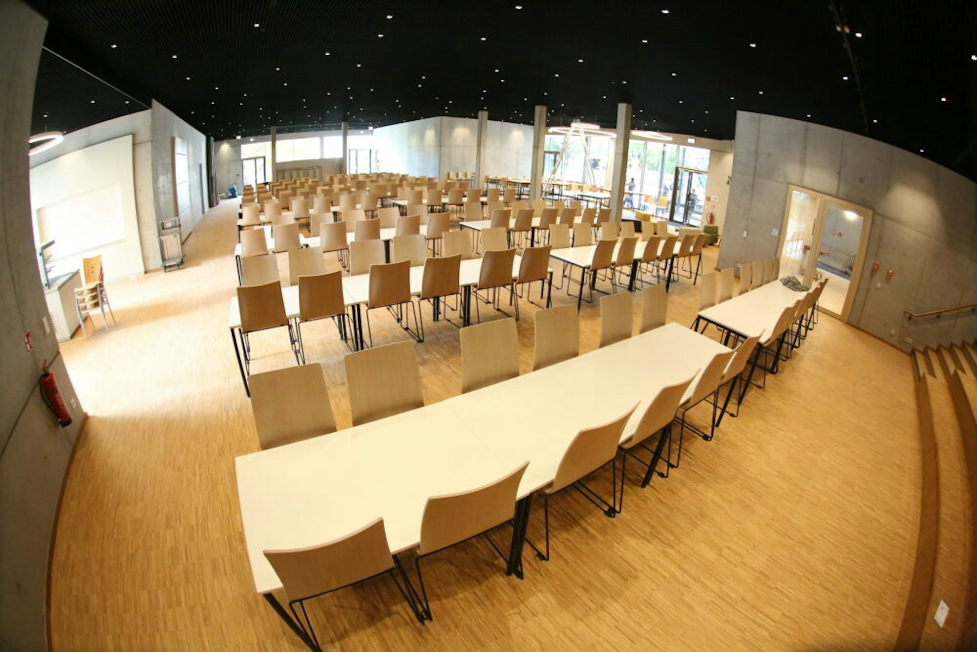 Lange Flure gibt es in dem Neubau nicht, stattdessen zentrale „Lernlandschaften“ mit Sitzwürfeln in Rot, Grün und Braun. Um diesen Raum gruppieren sich jeweils vier Klassenräume. Alle natürlich ausgestattet mit Beamer, auf die über Tablets sowohl die Lehrer als auch die Schüler zugreifen können sollen. Multifunktional nutzbar ist das Sankt-Josef-Forum, das sowohl Mensa – in drei Schichten können insgesamt 660 Kinder versorgt werden – als auch Veranstaltungsraum mit Bühne für 300 Personen ist. Wenn die neue Turnhalle steht (siehe auch Infotext), hat die Schule laut Stefan Rost 800 Plätze für Veranstaltungen zur Verfügung.