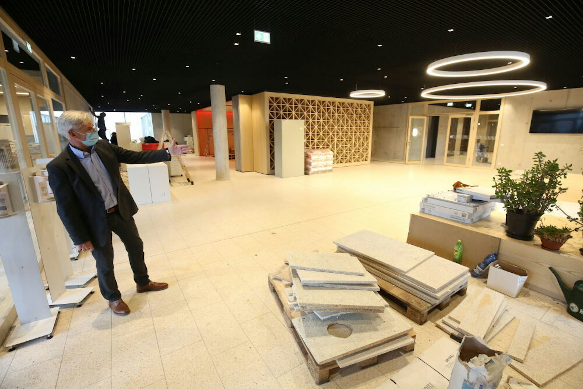 Eine Tür weiter öffnet sich die große Lehrküche, ausgestattet mit mehreren Spülbecken, Herden und Induktionskochfeldern. „Das ist besser als bei mir zu Hause“, sagt mit einem Augenzwinkern der Schulleiter der Erzbischöflichen Gesamtschule St. Josef, als er am Donnerstag die Presse einen Blick in den Neubau „seiner“ Schule werfen lässt. Und führt die Besucher weiter in zwei Kunsträume, in denen statt Tafeln interaktive Riesenmonitore stehen, sogenannte „ActivBoards“.