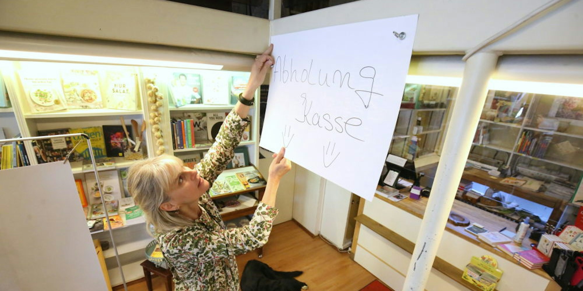 Ulrike Helmling hat an der Kasse ihrer Buchhandlung Werber einen Spuckschutz installiert sowie mehrere Schilder im Verkaufsraum.