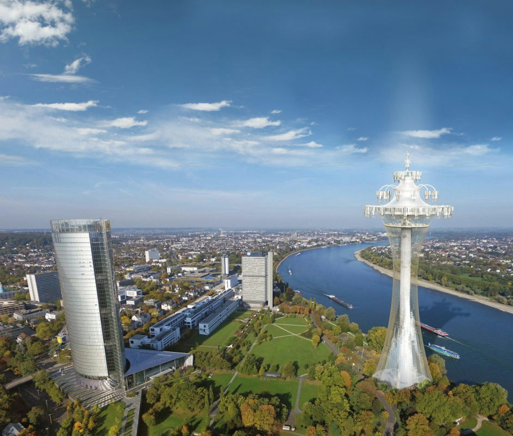 Wohl kaum ein Projekt in der Bundesstadt sorgt für so kontroverse Diskussionen wie der von Horst Burbulla auf dem städtischen Parkplatz an der Charles-de-Gaulle-Straße in der Rheinaue geplante Turm „Aire“ mit einem Veranstaltungssaal in gut 160 Metern Höhe. Die geschätzten Kosten von 80 Millionen Euro will Burbulla mit eigenem Geld sowie Mitteln seiner Stiftung und einer Hypothek finanzieren. Um seine Vision zu realisieren, hat der Bonner Erfinder und Maschinenbauer, der für einen Kamerakran mit einem Teleskopmechanismus 2004 einen Oscar erhielt, eigens ein Bürgerbegehren inszeniert. (wki)