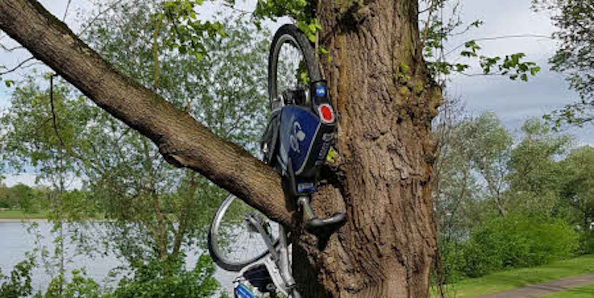 Nicht wirklich witzig: Irgendwer hat ein Nextbike-Leihfahrrad an der Rheinpromenade zwischen Niederdollendorf und Oberkassel in einer Astgabel „geparkt“.