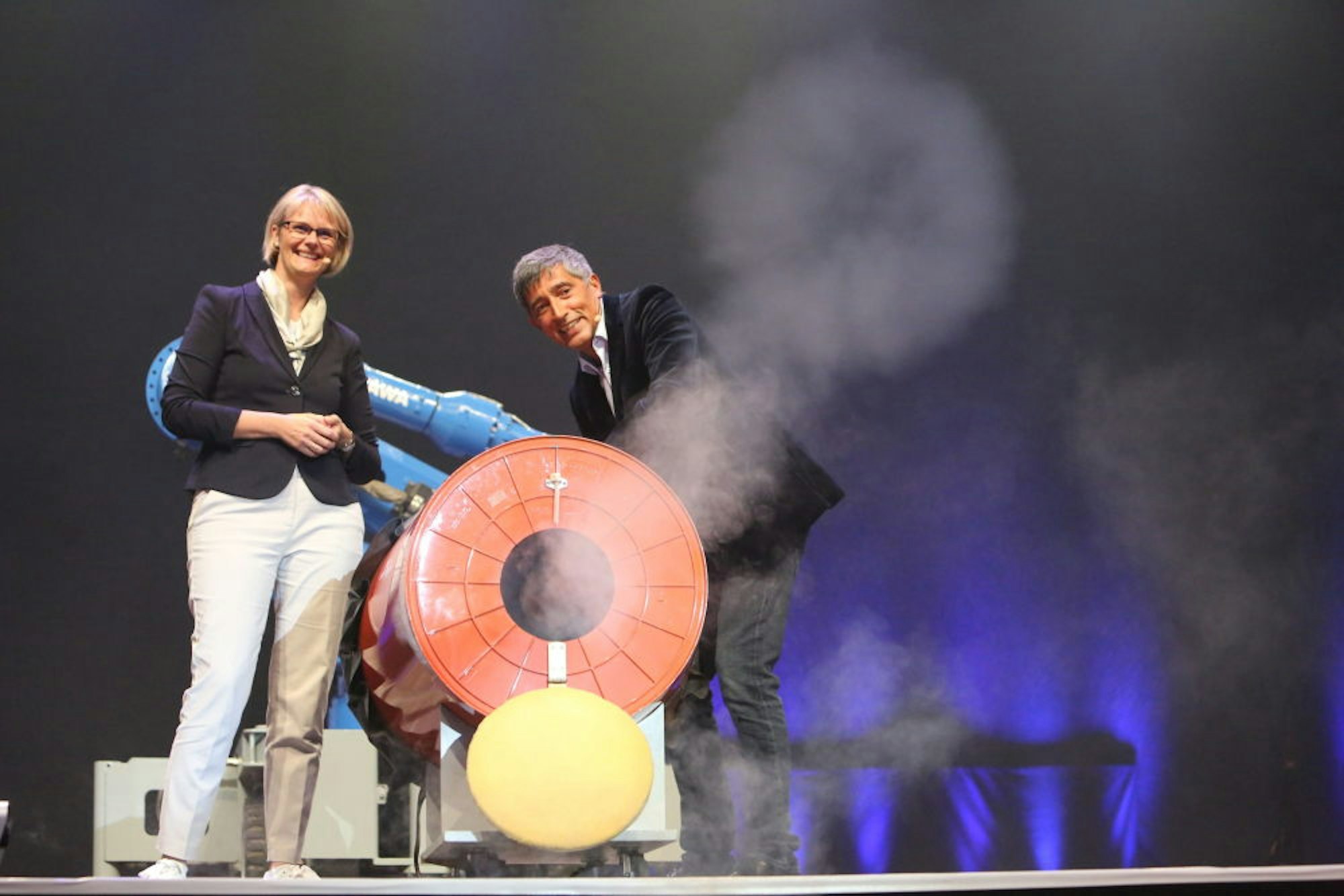 Mit einer Art Luftkanone machten Anja Karlicek und Ranga Yogeshwar eine Kerze aus und demonstrierten so Luftwirbel.