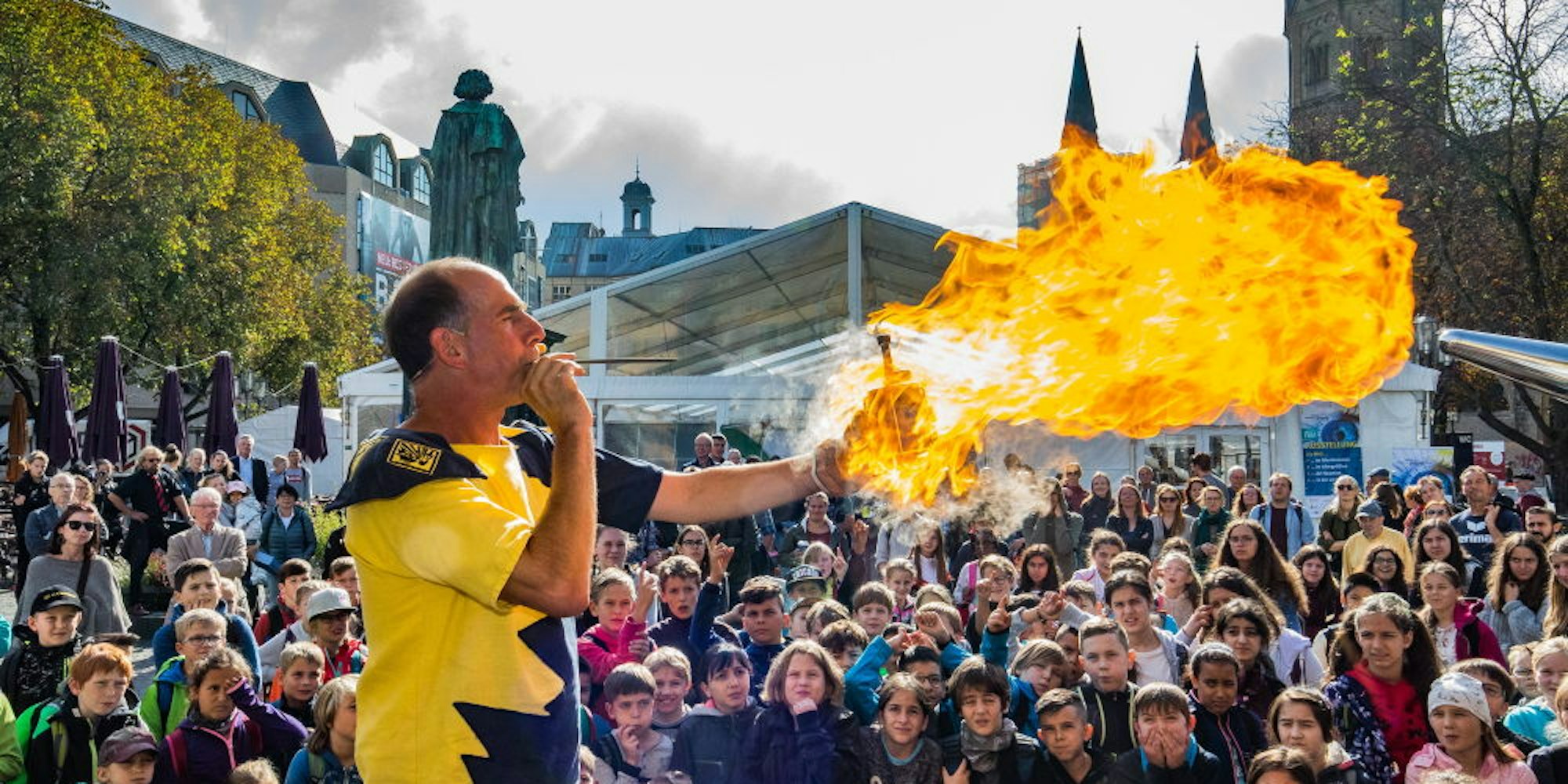 Feuerschlucker zeigten bei der Eröffnung der Mitmachausstellung auf dem Münsterplatz ihr Können.