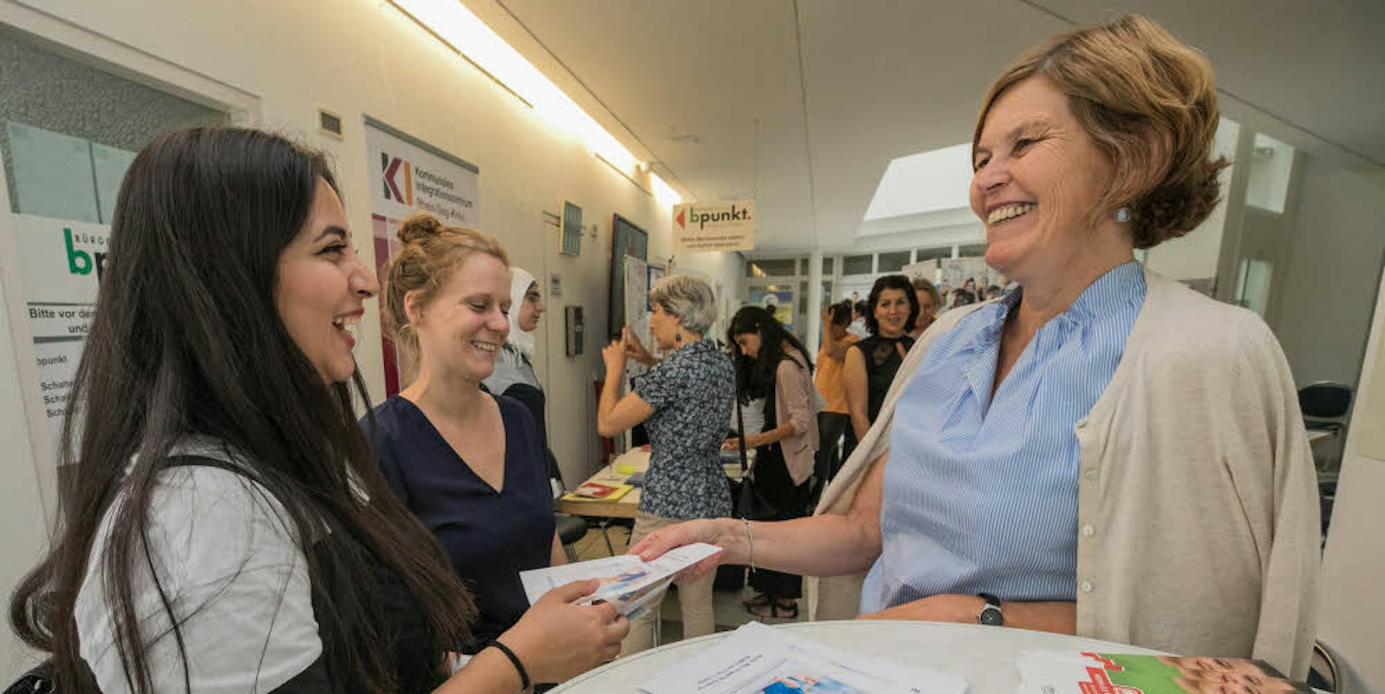 Auch Müneevver A. (35) aus der Türkei hat früher Englisch unterrichtet, bald arbeitet sie als Teilzeitkraft in einer Offenen Ganztagsschule. „In einem fremden Land muss man wieder bei null anfangen.“ Sie alle engagieren sich ehrenamtlich in der Flüchtlingshilfe und unterstützen andere Frauen dabei, sich in Deutschland zu integrieren. „Meine Zukunft in Deutschland“ ist nach dem Vorbild einer ähnlichen Veranstaltung entstanden, die in Bonn stattgefunden hatte.“