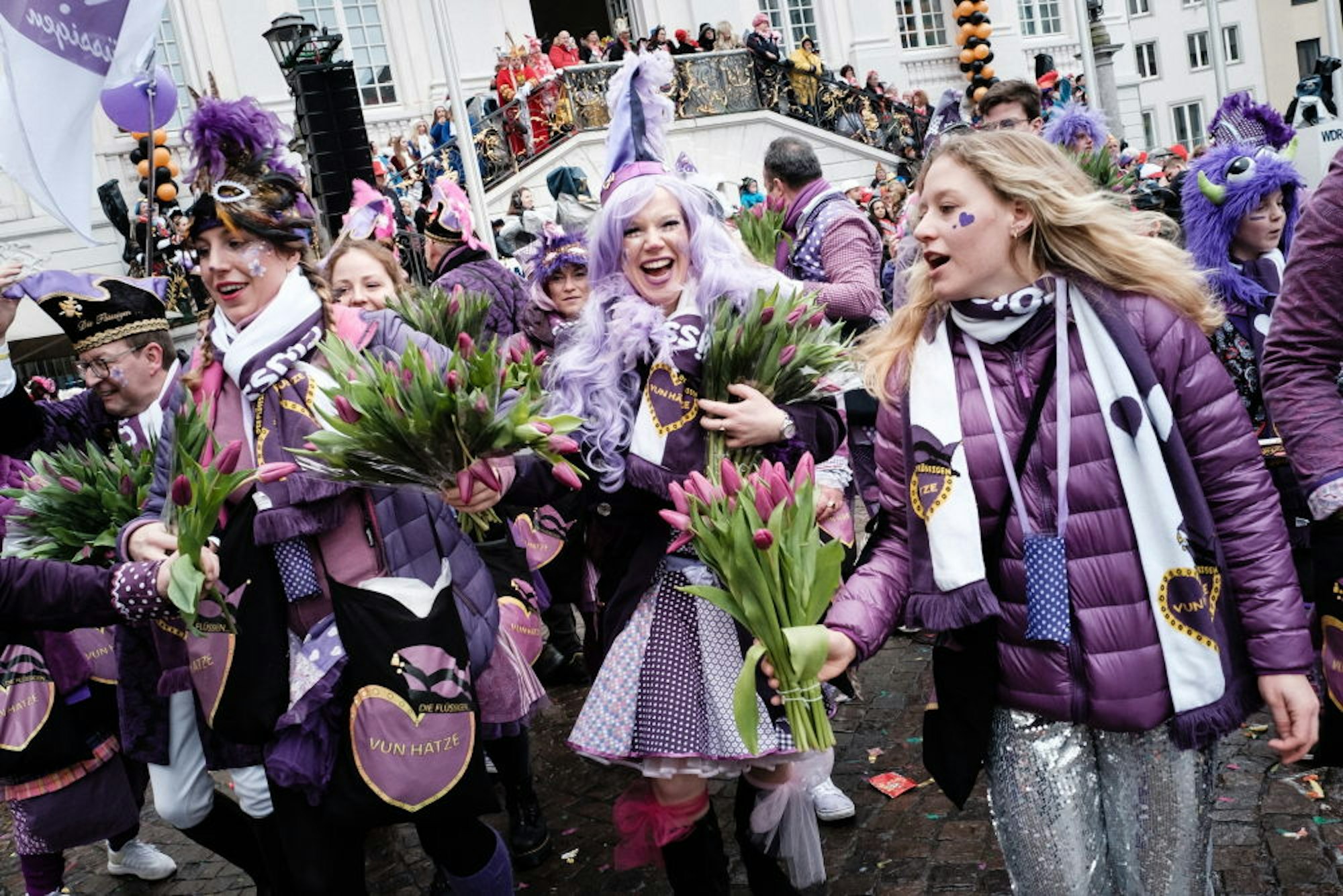 Reichlich Blumen verteilte die Gruppe „Die Flüssigen“ an die Jecken. Volker Derkum macht seiner Kerstin Heiderich auf dem Markt einen Heiratsantrag. Der Circus Comicus durften ebenso wenig fehlen wie Willi Bauckhage mit Ludwig van Beethoven. Der Hambacher Forst freute sich, dass er nicht gerodet wird, und Prinz Richard I. und Bonna Katharina III. genossen den Tagn (v.o. im Uhrzeigersinn).