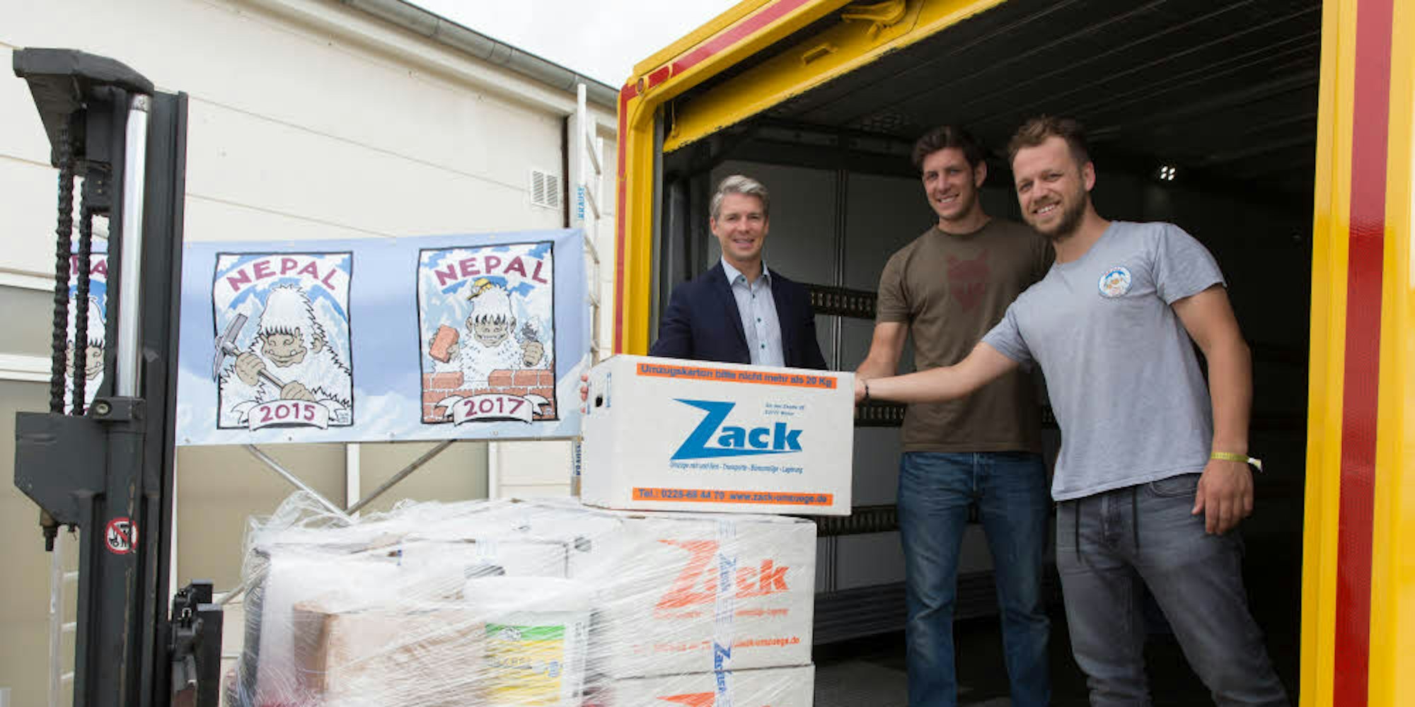 Ihr handwerkliches Geschick hilft ihnen auch bei den Hilfsprojekten in Nepal. Wenn sie im Oktober ihre Reise antreten, wird auch der hochwertige Kautschuk-Bodenbelag für das Hospital, den sie bei ihrem Aufenthalt in Nepal mit der Unterstützung Einheimischer verlegen wollen, dort angekommen sein: etwa 1700 Quadratmeter. Insgesamt zehn Paletten mit je 16 Rollen Bodenbelag, weitere Paletten mit Haftgrund und Kleber sowie zehn Computer für die Schule in Chepang, alles zusammen etwa rund 7,5 Tonnen, packten sie jetzt im Gewerbegebiet in Sechtem in einen etwa 14 Meter langen DHL-Transporter. Die Firma Nora Systems hat die Kosten für den Bodenbelag und DHL die für den Transport ins rund 12000 Kilometer entfernte Land übernommen. „Der Verein hat uns gefragt und wir haben uns bereit erklärt, die Kosten zu übernehmen“, sagt dazu DHL-Manager Michael Kossytorz. Zunächst geht die Fracht im Lkw nach Hamburg, am 10. August wird sie aufs Schiff nach Kalkutta verladen. Von dort soll ein lokaler Partner für den Weitertransport der Fracht zur Einsatzstelle sorgen. „Ich gehe davon aus, dass sie in spätestens sechs Wochen in Nepal, in der Provinz Chitwan eintrifft“, so Kossytorz.