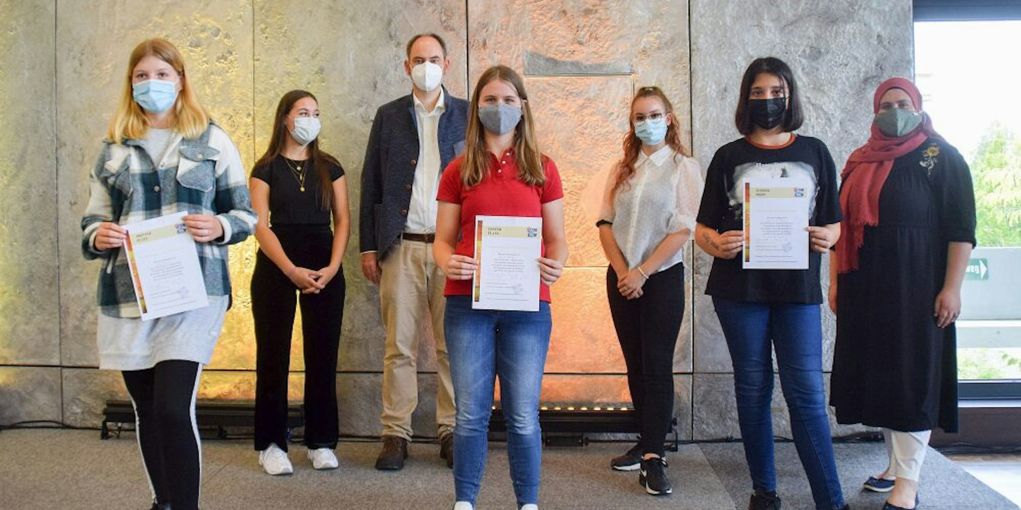 Die Siegerinnen Lina Franken (vorne, v.l.), Denise Baudach (Mitte) und Yumna El-Zayat mit den Juroren Dila Bayar (hinten, v.l.) und Johannes Lotz, Jennifer Keil und Sarah El-Zayat vom Stadtjugendring.