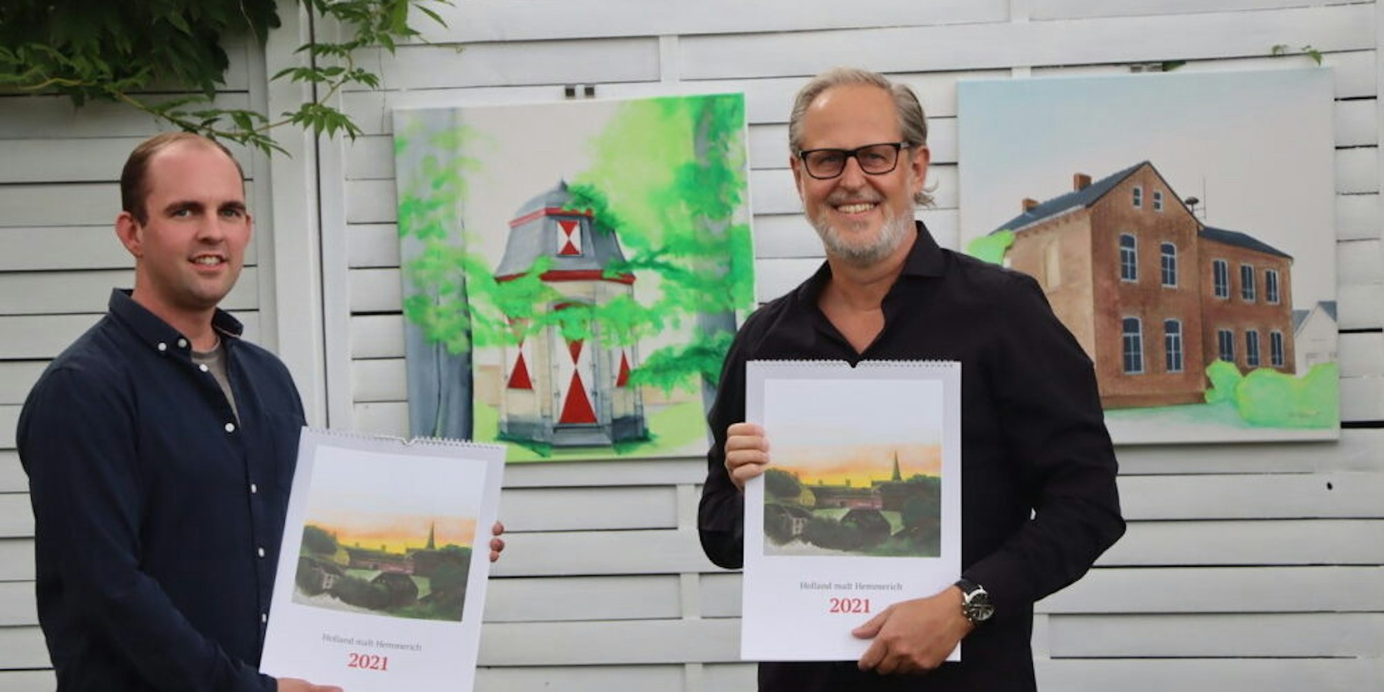 „Der eigentlichen Malerei ist ein gemeinsamer Spaziergang mit Christoph Eichen und der Kamera durch den Ort vorausgegangen“, berichtete der Maler. Zusammen haben sie die Motive unterwegs ausgesucht und von ihrer schönsten Seite abgelichtet. Von der Fotografie hat Holland die teils historischen Gebäude und Wahrzeichen des Ortes dann an seiner Staffelei zu Hause auf die Leinwand übertragen. Richtig stolz wirkten die beiden Macher dieses künstlerischen Projekts, als sie den Wandkalender nun erstmals in den Händen hielten. „Er ist richtig schön geworden“, schwärmte Eichen.