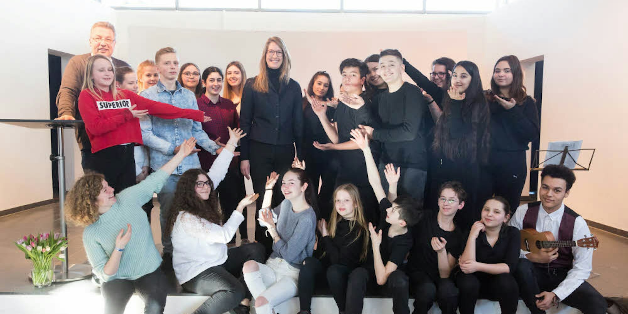 Schüler, die bei der Feier auftraten, und der kommissarische Schulleiter Christoph Kaletsch (hinten links), verabschiedeten Astrid Geschwind (oben Mitte).