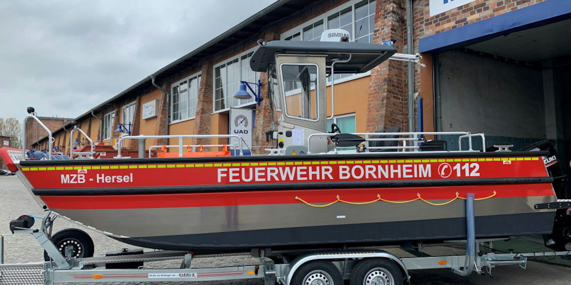 Der silbrig glänzende Aluminiumrumpf ist am oberen Rand schon in Feuerwehrrot eingefärbt und trägt bereits die Aufschrift „Feuerwehr Bornheim“. Am Bug ist durch die Aufschrift „MZB - Hersel“ der Heimatort erkennbar.