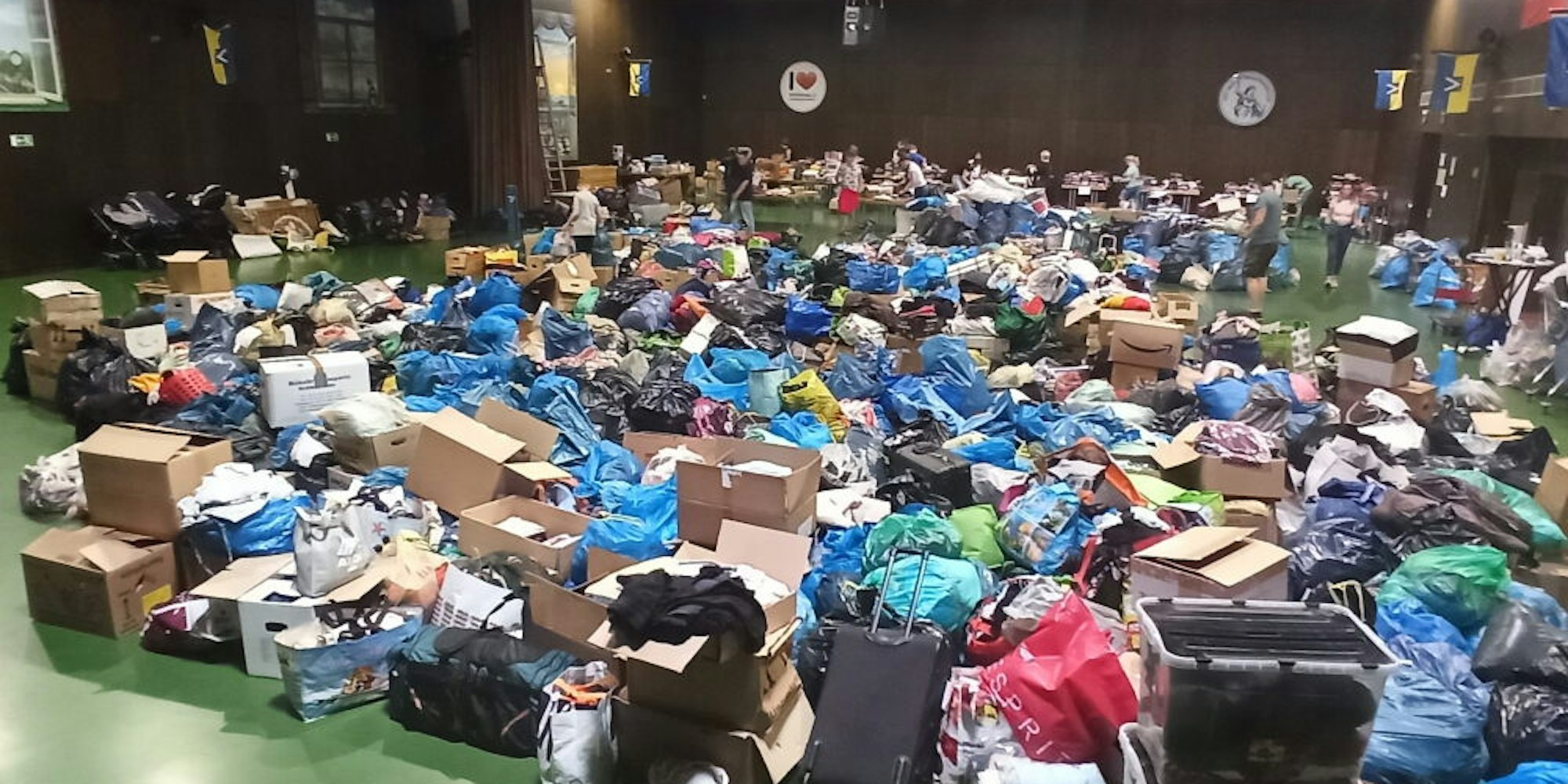 Die Solidarität ist riesig: In der Rheinhalle in Hersel kamen zahlreiche Kleiderspenden zusammen.