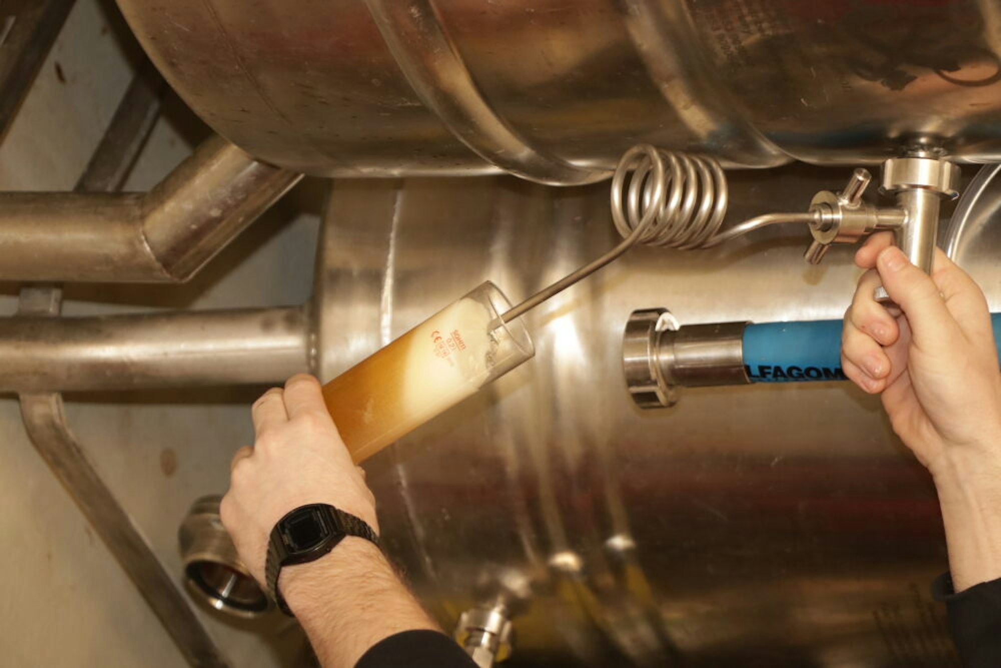 Ein Testbier zapft der gelernte Brauer und Mälzer aus seiner heimischen Apparatur.