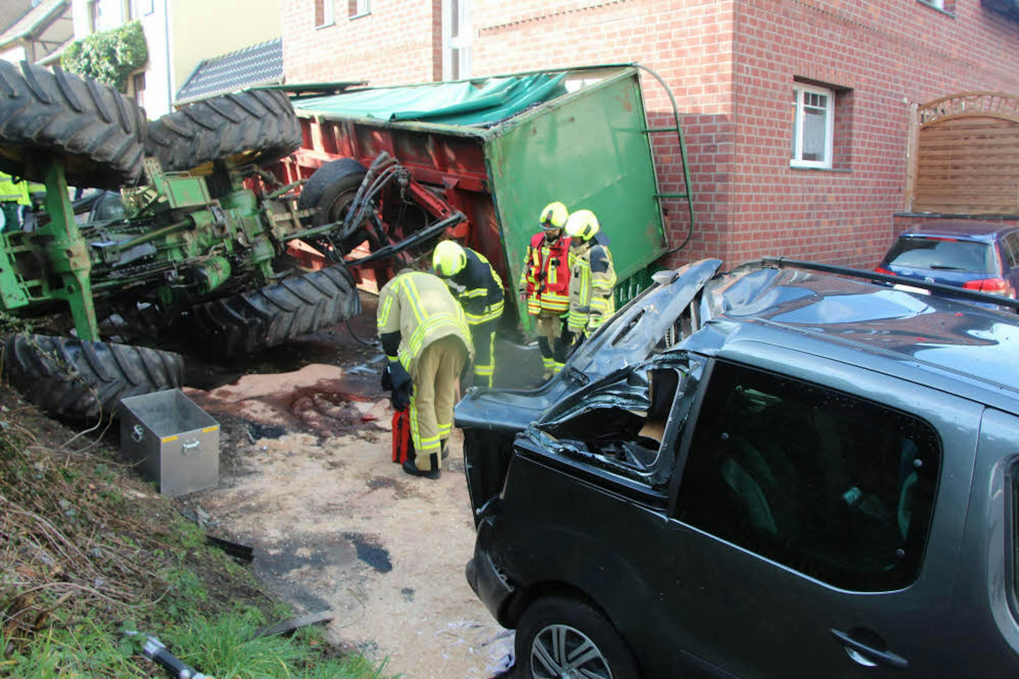 Der schwere Traktor kippte um, prallte gegen einen geparkten Citroen und blockierte die Fahrbahn, ein Anhänger wurde gegen ein Haus gedrückt.