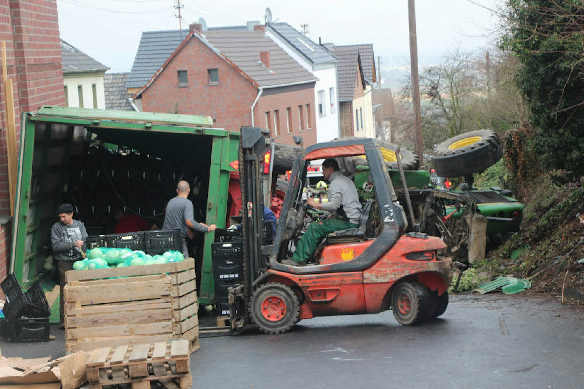 Das Gemüse musste von den umgestürzten Anhängern umgeladen werden, bevor der Traktor aufgerichtet werden konnte.