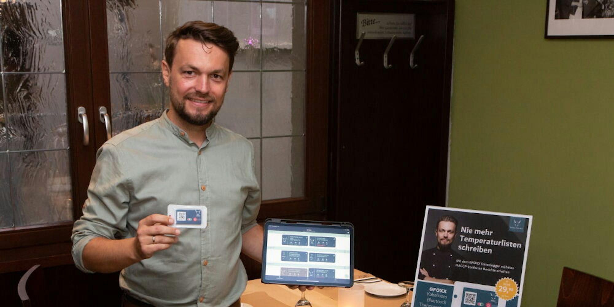 Gemeinsam mit einem Freund habe ich die Zeit genutzt, um ein zweites Standbein aufzubauen. Wir haben das Start-up-Unternehmen PolarFoxx.com gegründet. Der Hintergrund ist ganz einfach: Gastronomen müssen wie alle anderen Betriebe, die Lebensmittel aufbewahren, wie zum Beispiel Bäckereien, Eisdielen, Metzgereien, Caterer oder Lebensmitteldienstleister, die Lagertemperaturen einmal täglich dokumentieren. Mit einem Freund habe ich dazu eine digitale Methode mithilfe eines kabellosen Bluetooth Thermometers entwickelt. Der sogenannte Datenlogger, den wir mittlerweile in China herstellen lassen, ist ein batteriebetriebener Mini-Computer. Er wird einfach in das Kühlgerät gelegt. Über die kostenlose App kann man dank Bluetooth jederzeit seinen Temperaturbericht vollautomatisch auf dem Smartphone oder Tablet erzeugen. Wer unser System nutzt, ist jederzeit optimal auf Lebensmittelkontrollen vorbereitet. Zusätzlich können unsere Kunden mithilfe der App Reinigungspläne sowie Hygiene- und Mitarbeiterberichte erfassen.