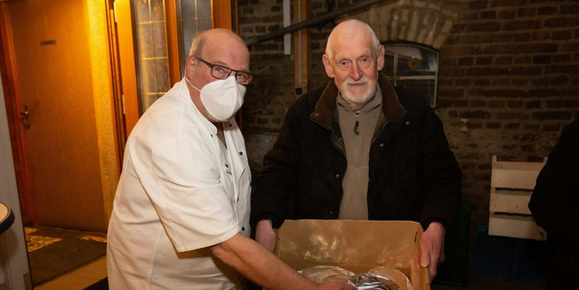 Die Transportbox hat Rolf Solscheid selbst mitgebracht, um bei Hans Willi Schiefbahn (l.) in der Gaststätte Kreuel eine Portion Schnitzel abzuholen.