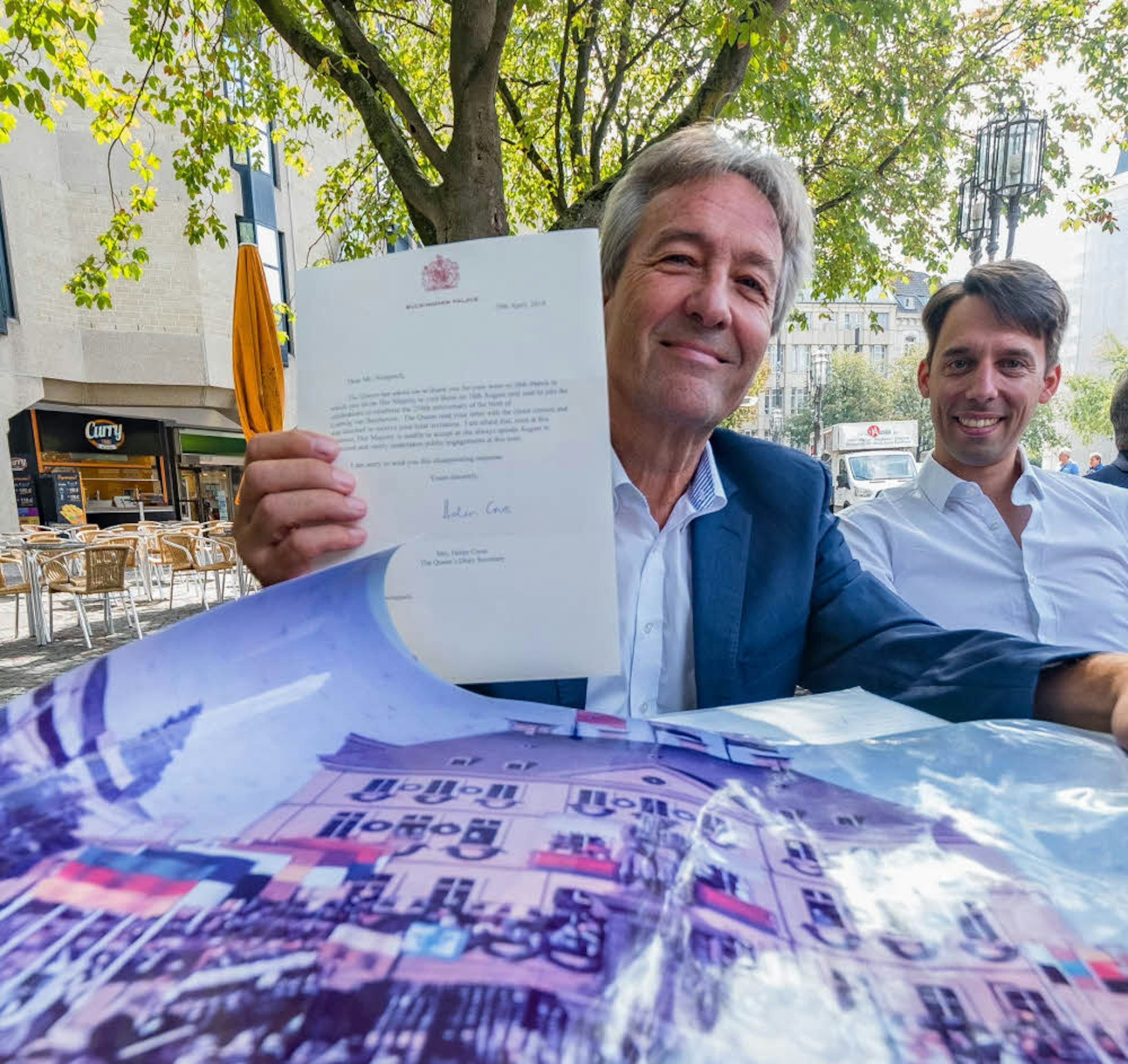 Der offiziellen Einladung zu dem historischen Spektakel anlässlich des 175. Jahrestages der Enthüllung des Beethoven-Denkmals in Bonn im kommenden Jahr seitens des Organisationsteams folgte aber eine Absage des Buckingham-Palastes vom 29. April: „Unfortunately . . .“ weiter auf Deutsch: „Unglücklicherweise kann Ihre Majestät der Einladung nicht Folge leisten, da sie sich an diesem Tag im Sommerurlaub auf Schloss Balmoral in Schottland befindet. gez: Helen Cross, Protokollamt Buckingham Palace.“