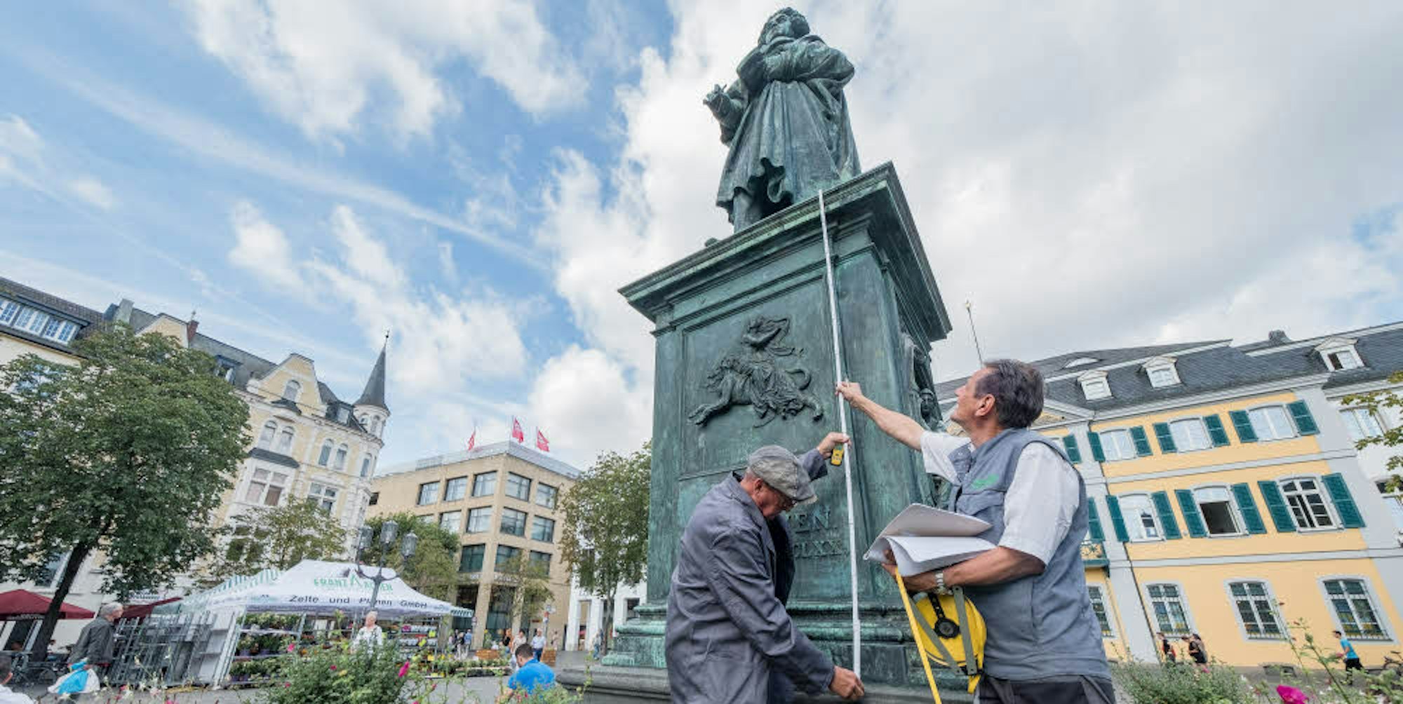 Dass die „deckende Hülle“ auch am 16. August 2020 „wie durch Zauberschlag“ fallen wird, dafür sorgt die Spezialfirma Aachen. Der Chef des Unternehmens, Franz Aachen, nahm gestern in schlichtem Malerkittel die genauen Abmessungen vor. In einem Jahr wird er die Zeremonie in einem prächtigen historischen Kostüm vollziehen. Soviel Tradition muss ein!