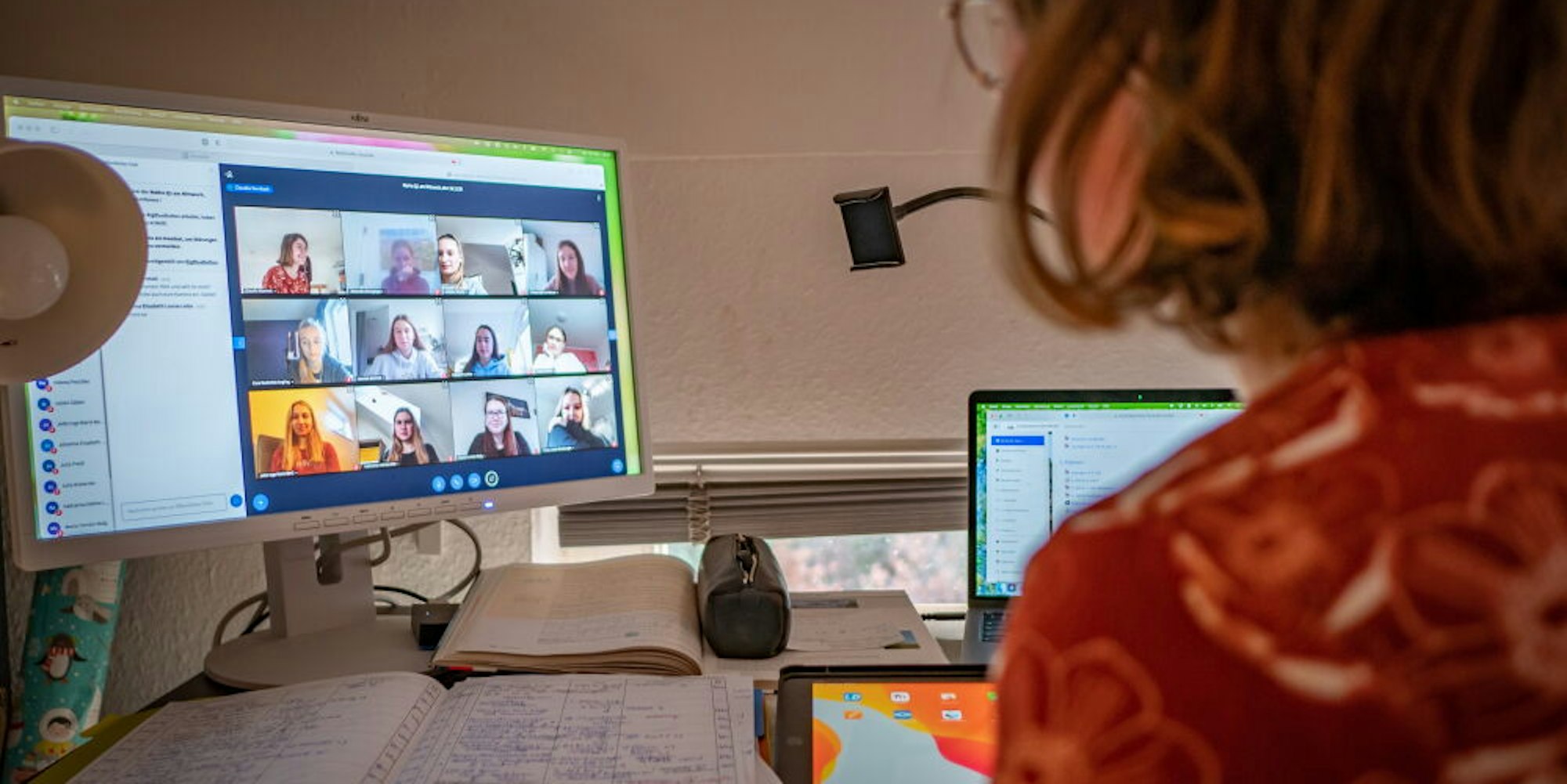 Lehrerin Claudia Vornholt vom Gymnasium der Ursulinenschule in Bornheim-Hersel leitet ihre Schulstunde von zu Hause aus über den Computer.